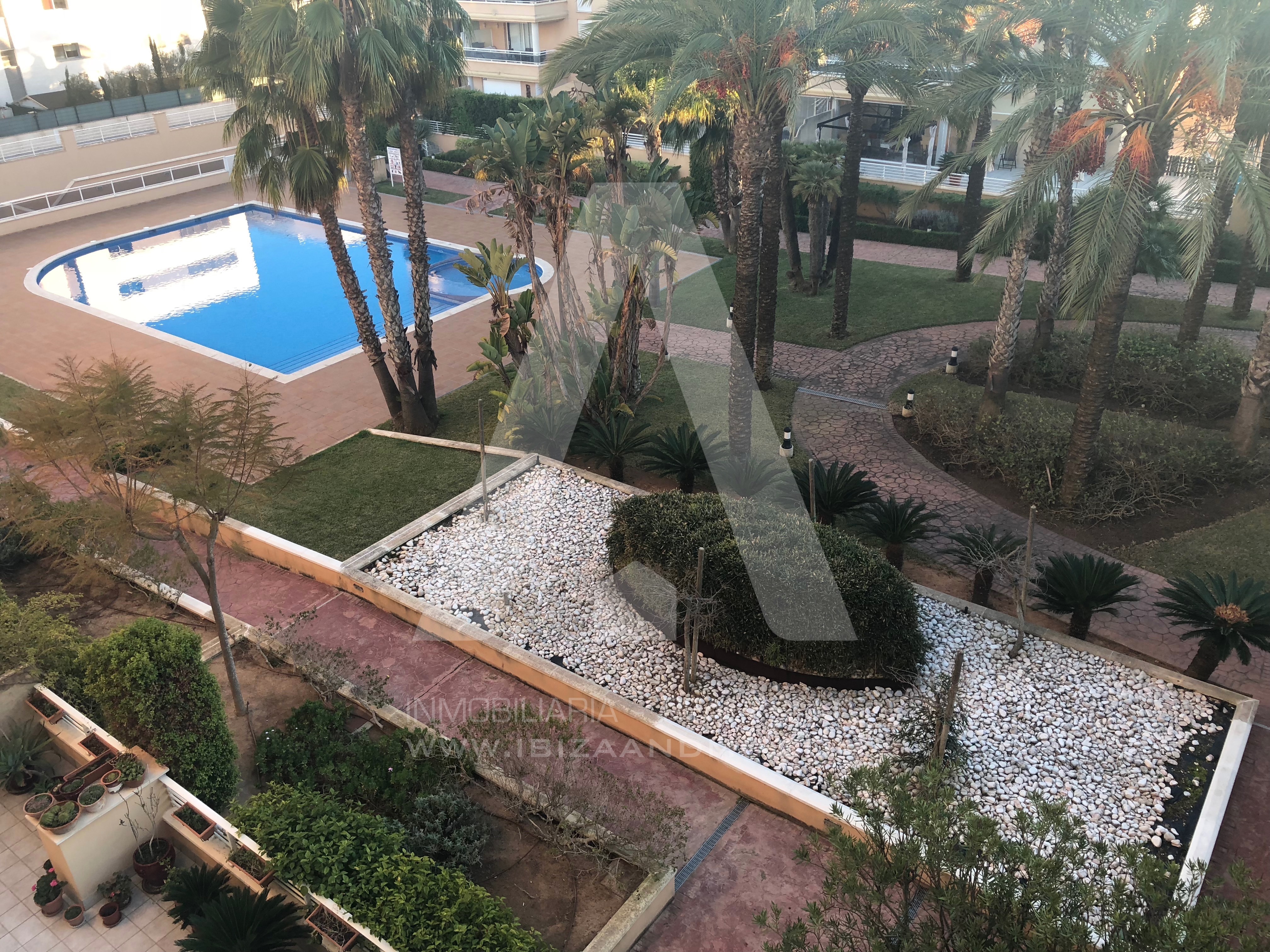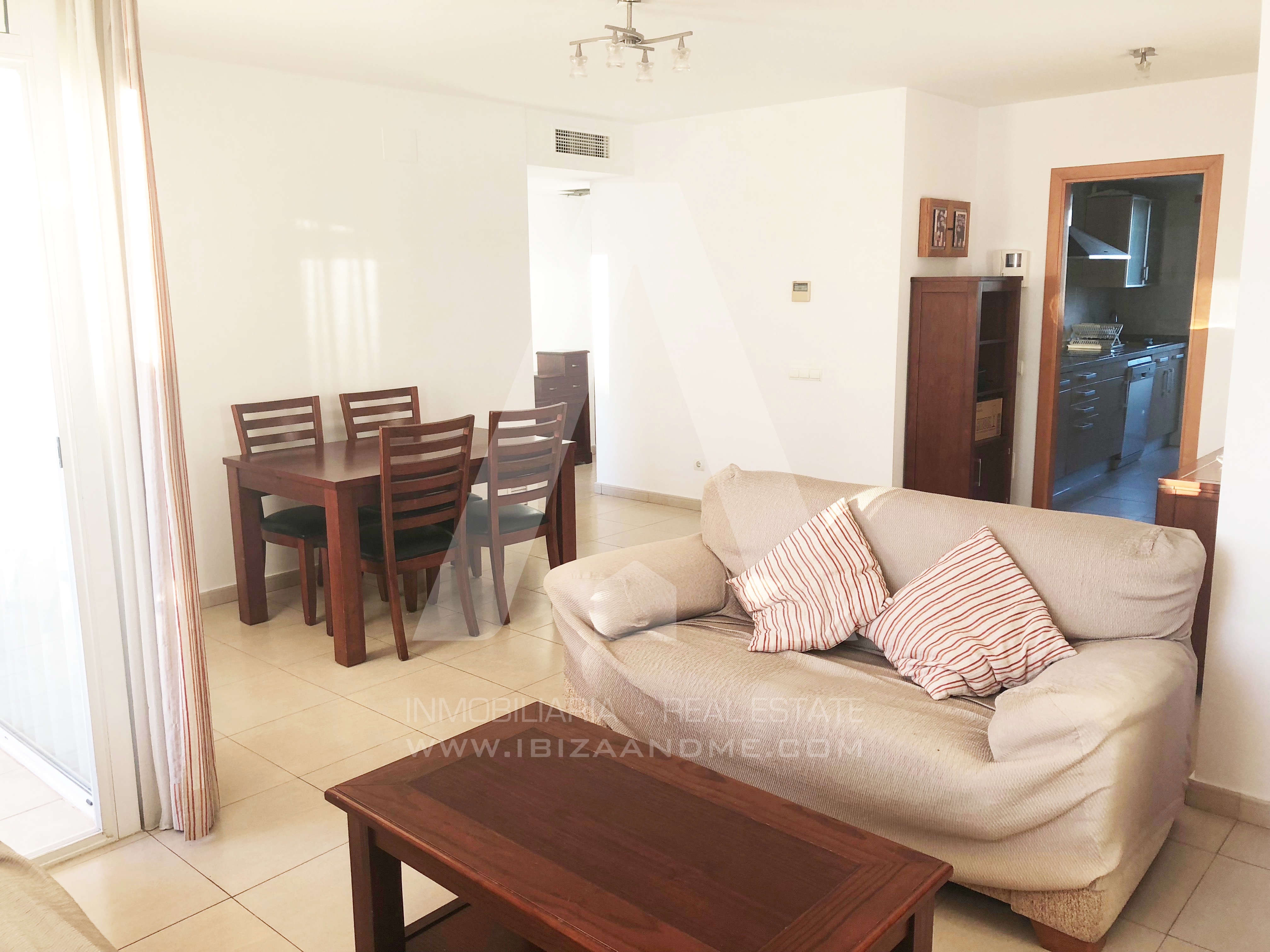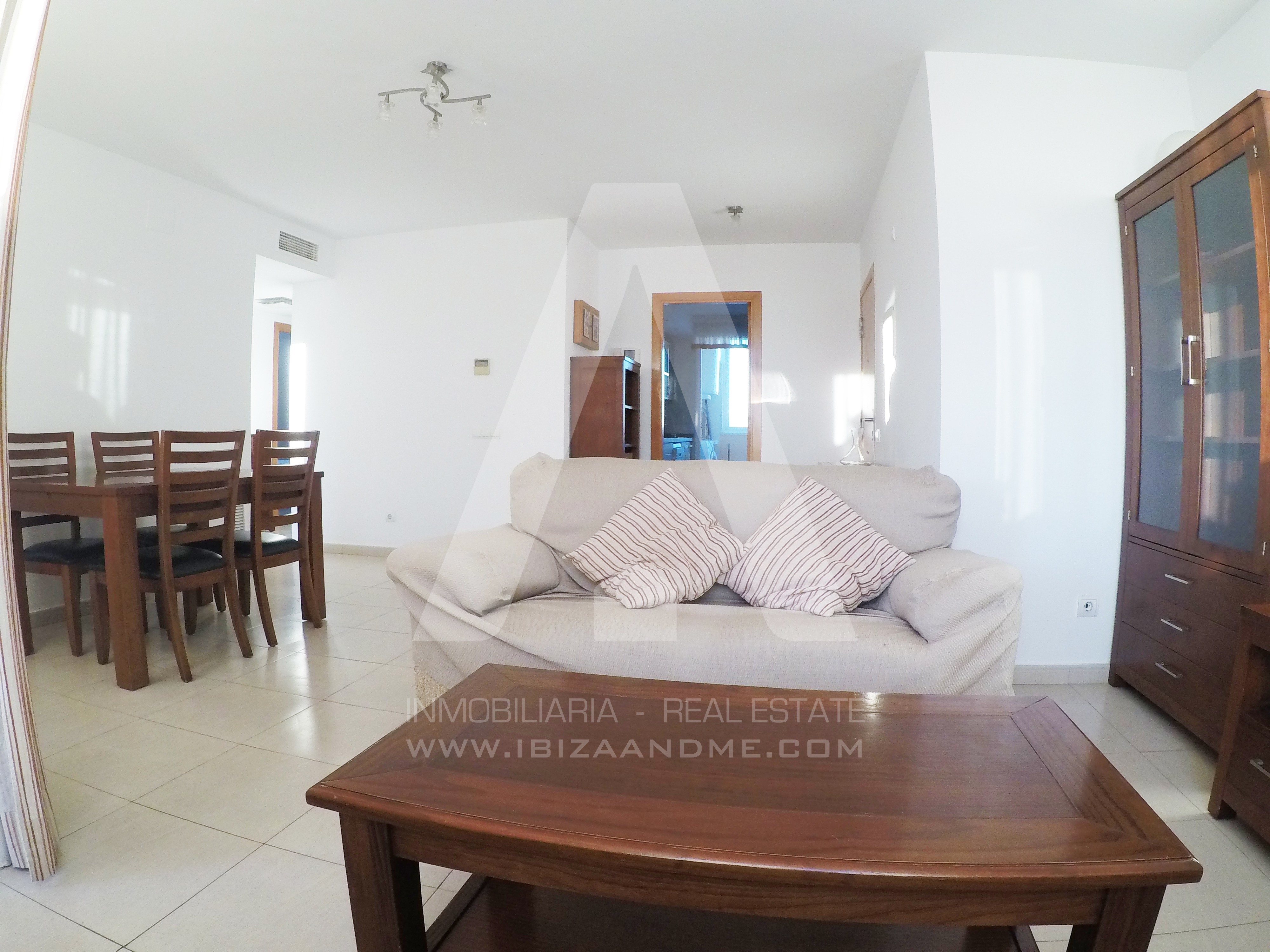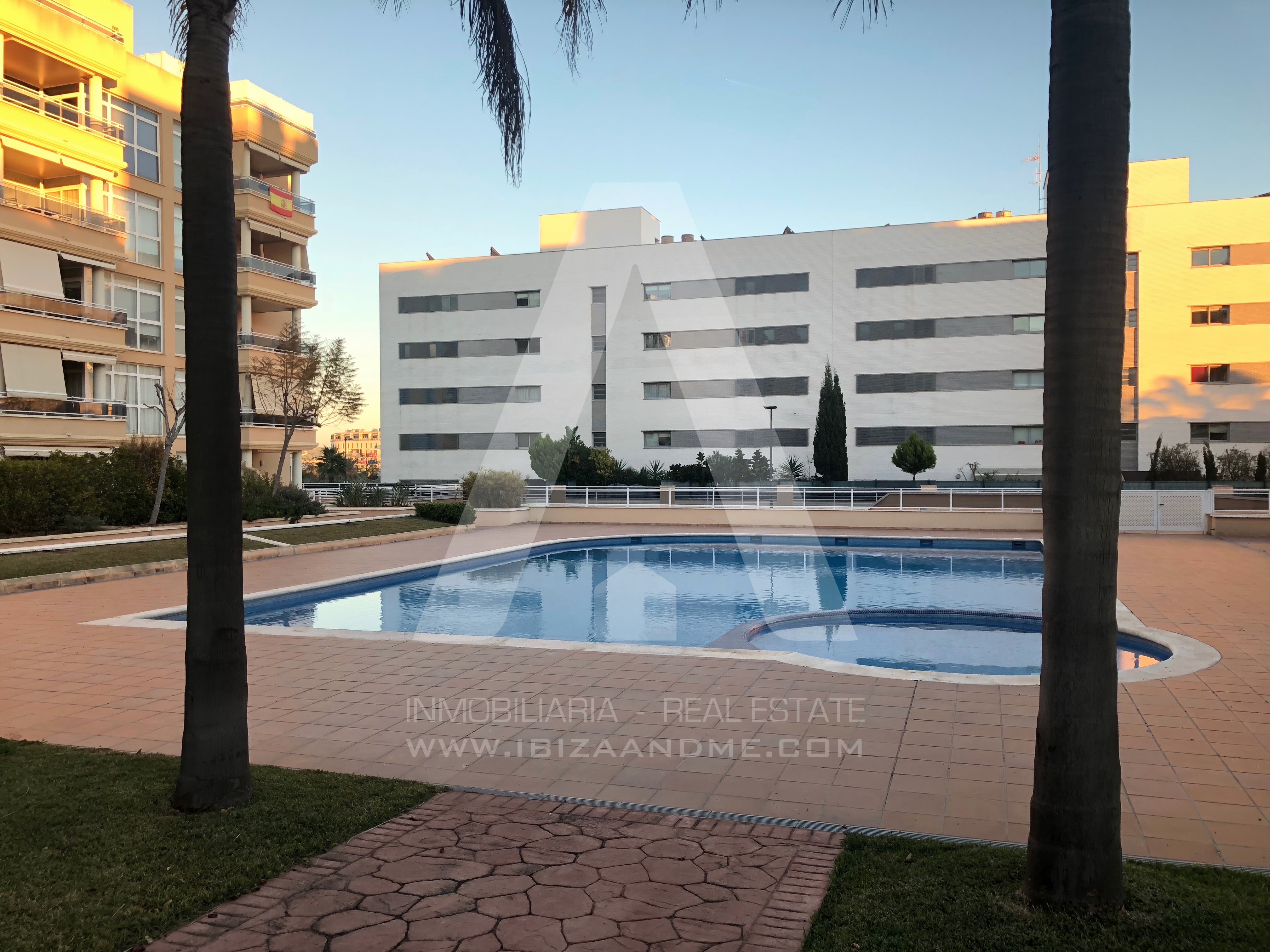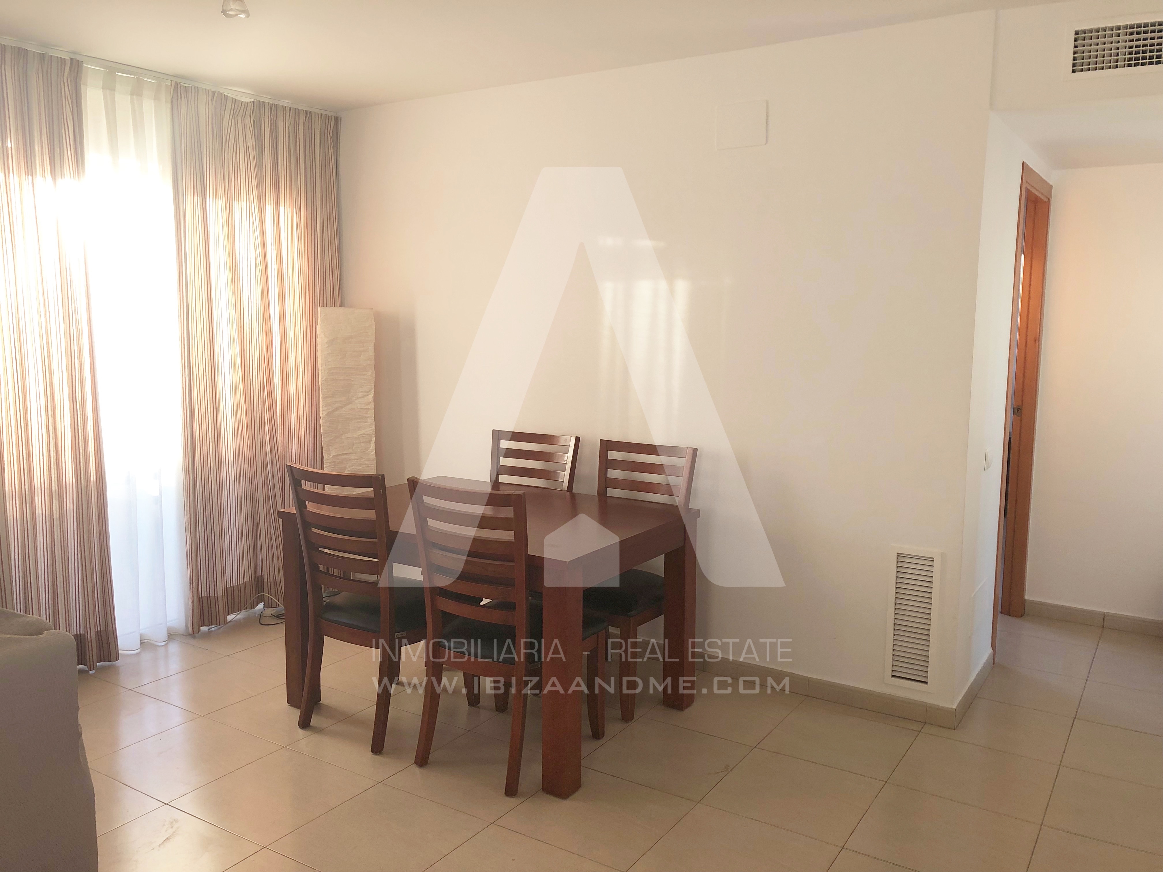 Bonito piso en urbanización exclusiva ubicada en la zona de Can Misses. Con tres habitaciones y dos WC, encontramos un amplio salón comedor y una práctica cocina con lavadero. En el exterior se puede disfrutar de amplias zonas comunes ajardinadas y una piscina comunitaria. Cuenta con una terraza de 12m2 y dos plazas de garaje.