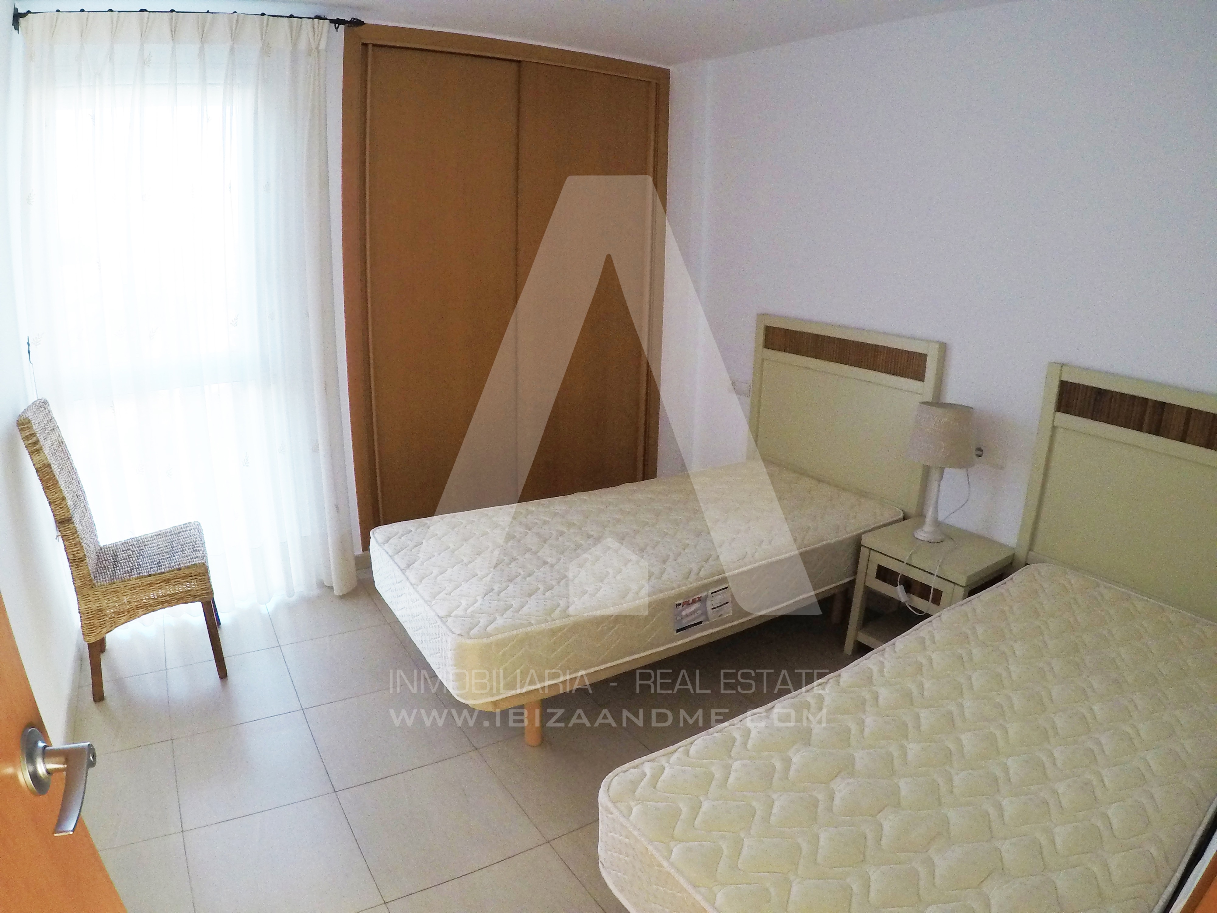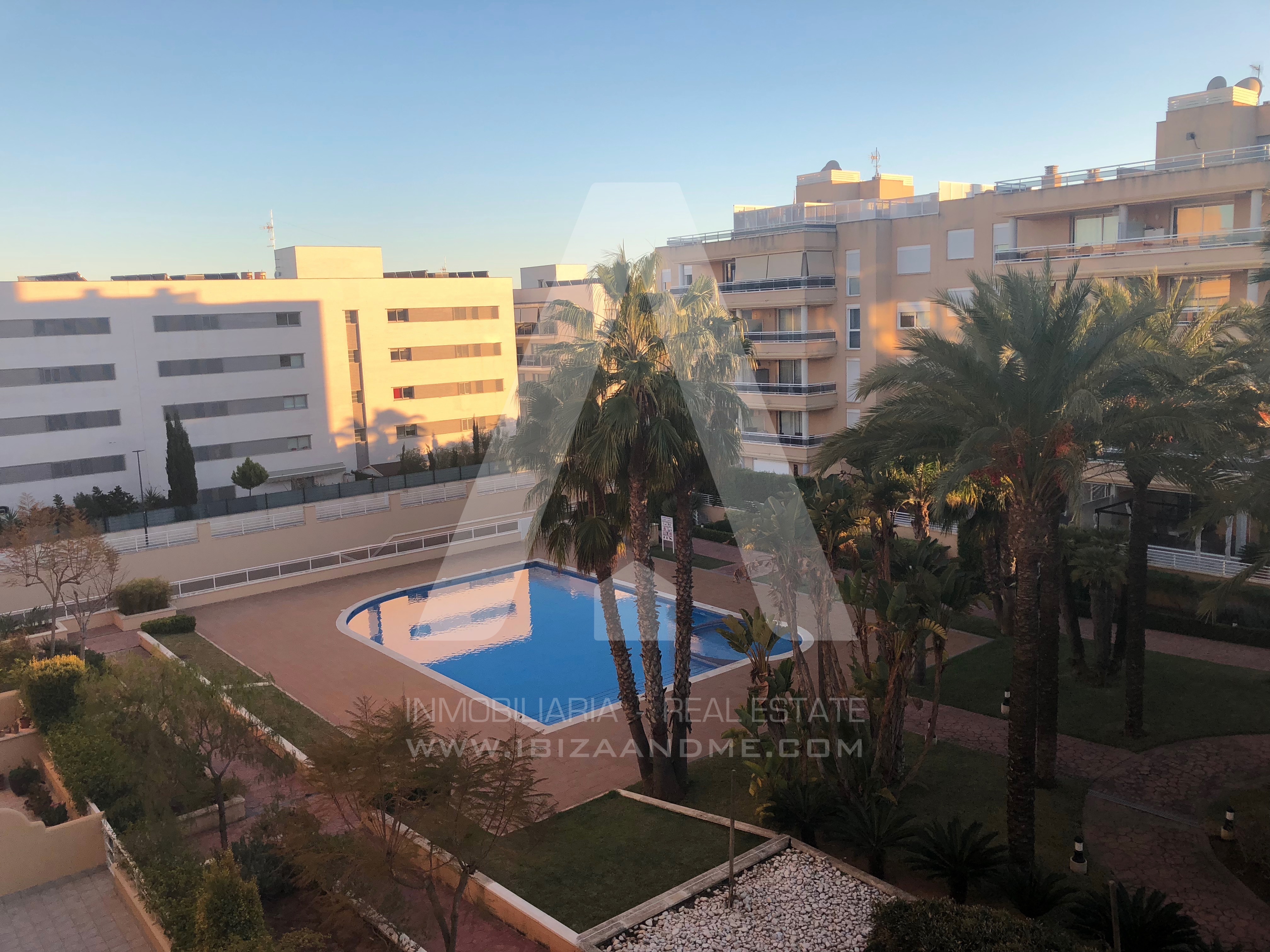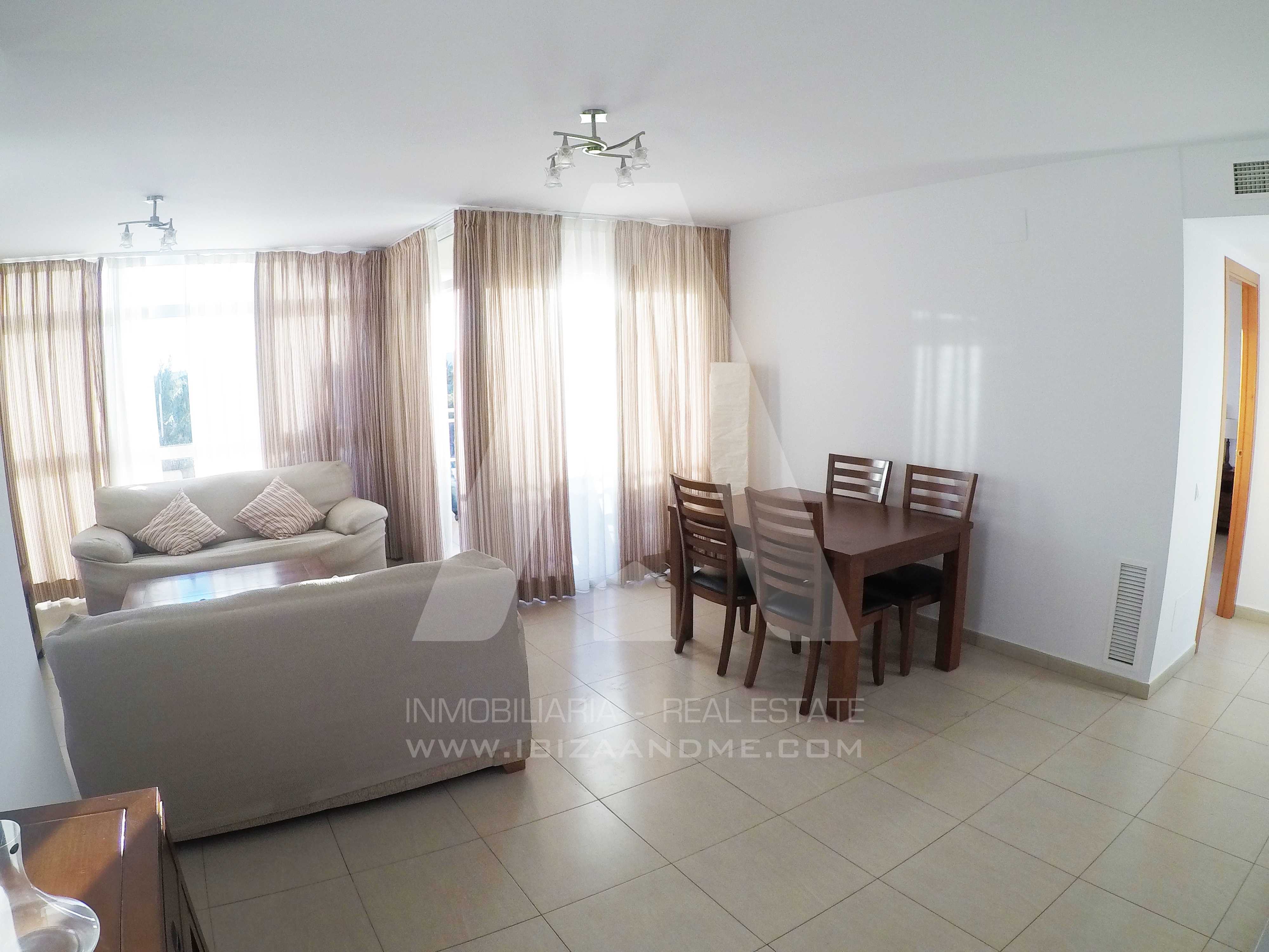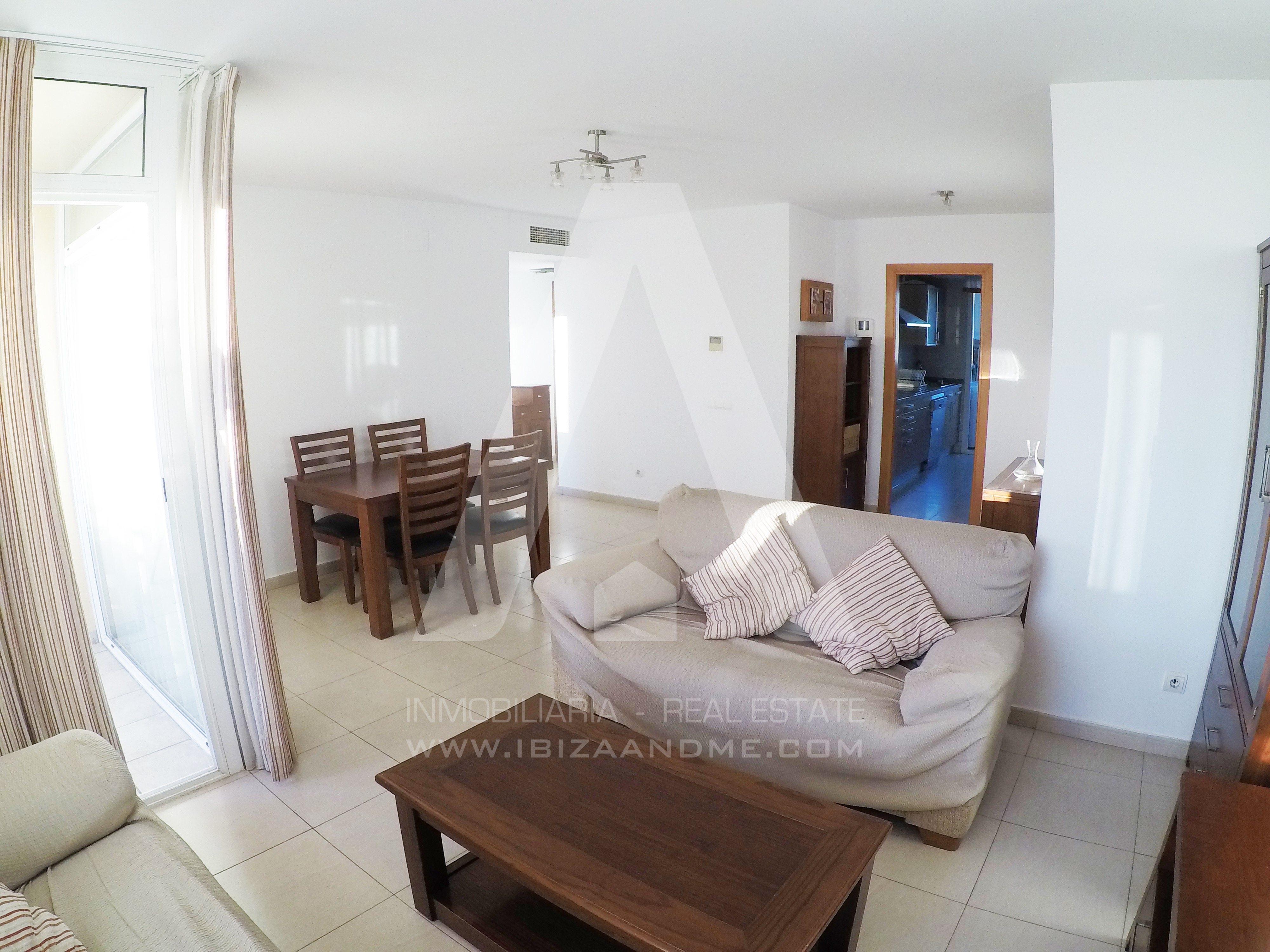 Bonito piso en urbanización exclusiva ubicada en la zona de Can Misses. Con tres habitaciones y dos WC, encontramos un amplio salón comedor y una práctica cocina con lavadero. En el exterior se puede disfrutar de amplias zonas comunes ajardinadas y una piscina comunitaria. Cuenta con una terraza de 12m2 y dos plazas de garaje.