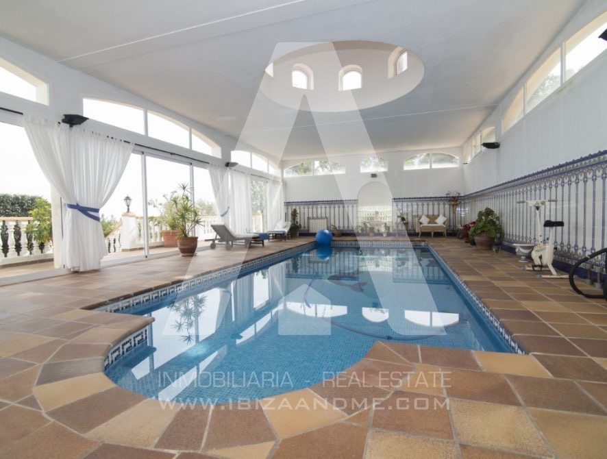 Una rareza para Ibiza es la piscina interior climatizada totalmente cerrada que permite su uso los 365 días del año.