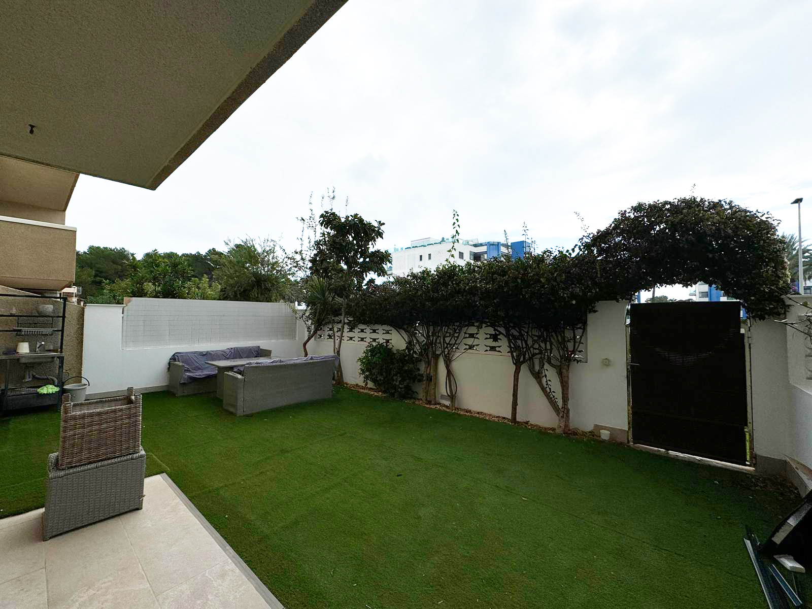 En el exterior cuenta con una espaciosa terraza con césped artificial, perfecta para disfrutar en familia.