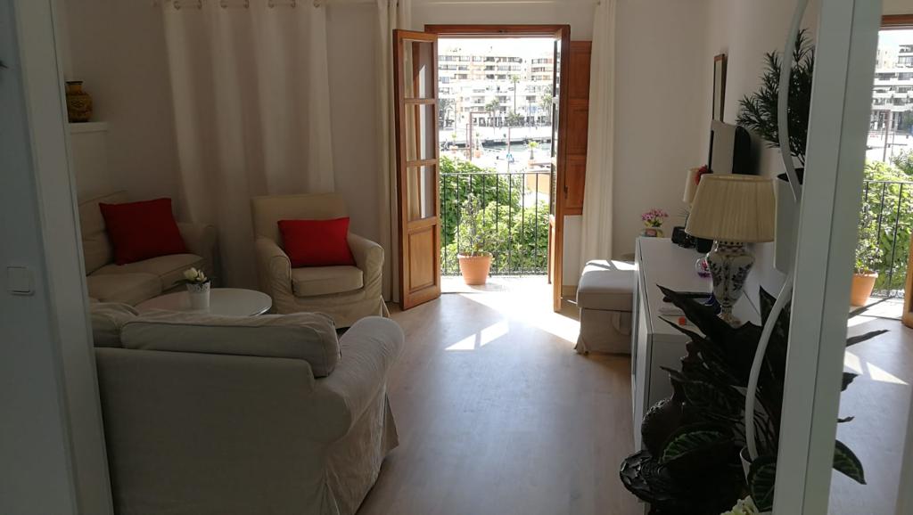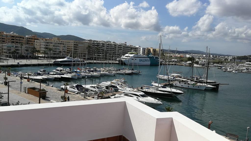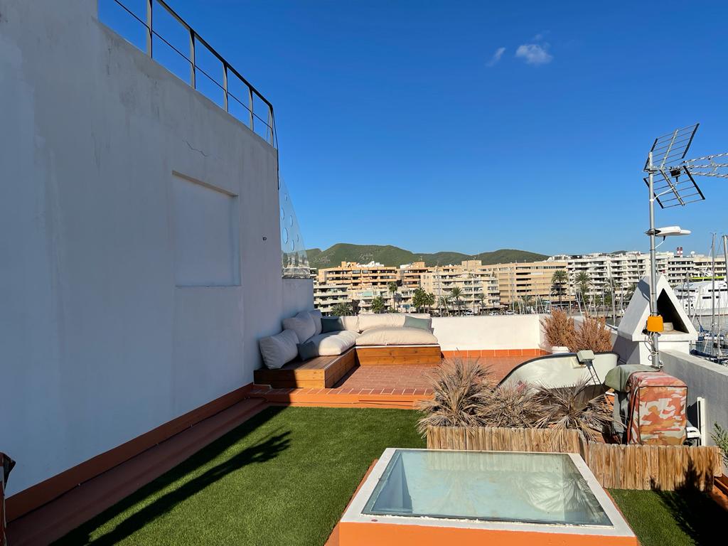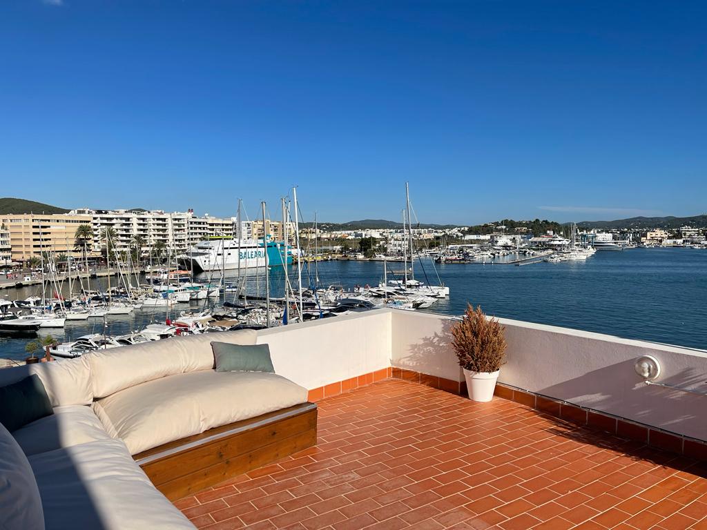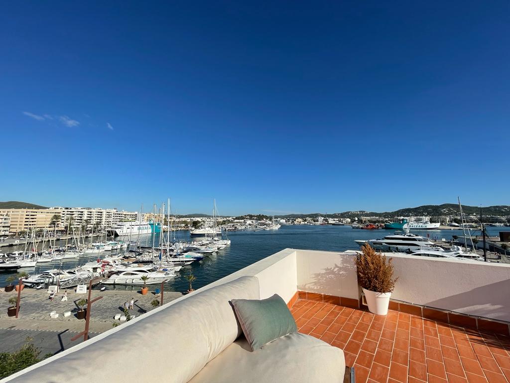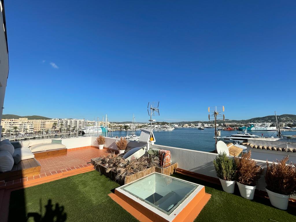 Bonito piso en alquiler en el puerto de Ibiza. Con una habitación de matrimonio, baño, un amplio salón comedor y cocina en office en la primera planta, cuenta con una segunda altura con dos habitaciones, otro baño y terraza. Inmejorable ubicación, en primera línea del puerto.