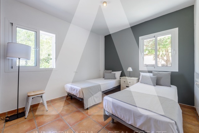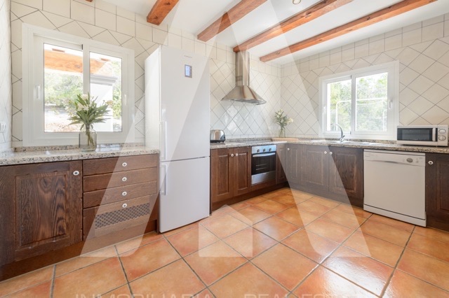La casa consta de cinco habitaciones, tres de las cuales cuentan con baño propio. Encontramos una sala de estar espaciosa y conectada con una cocina abierta con vistas y acceso directo a la zona de jardín y piscina. La disposición de la propiedad es perfecta para una familia con invitados.