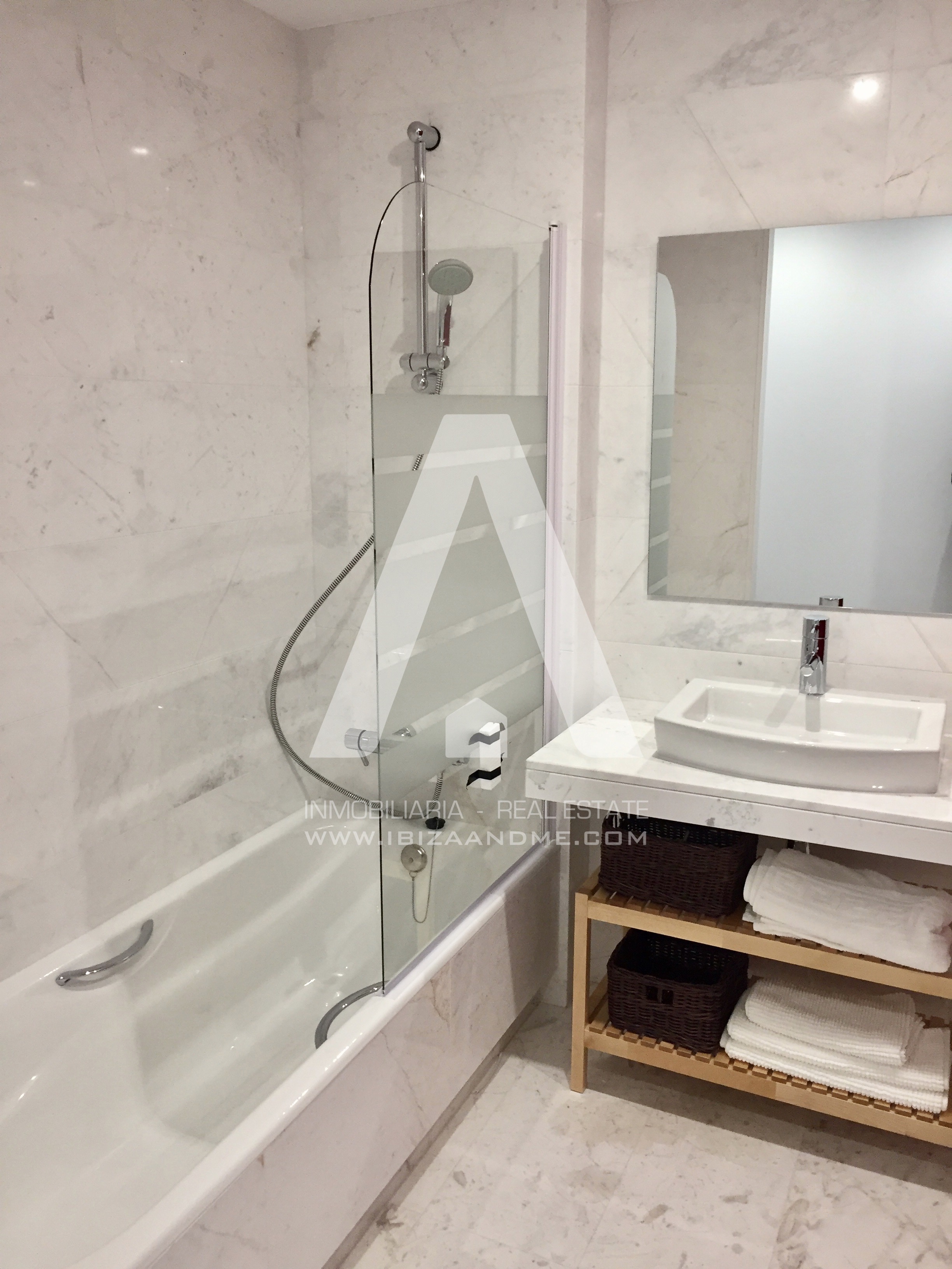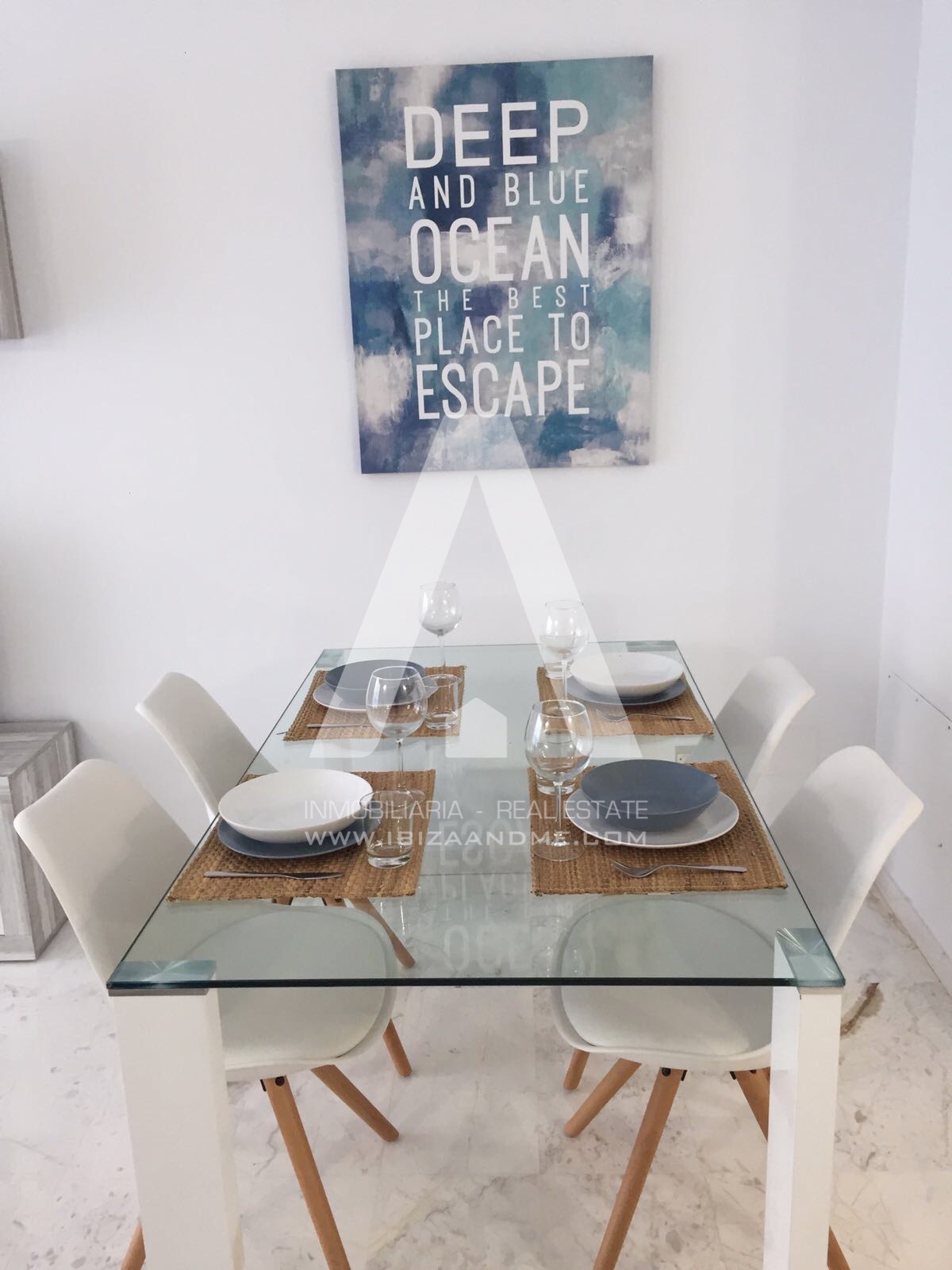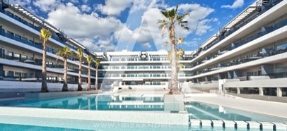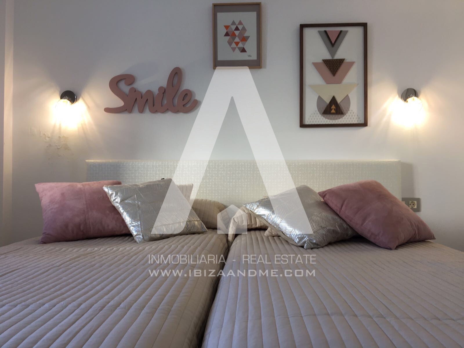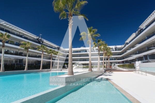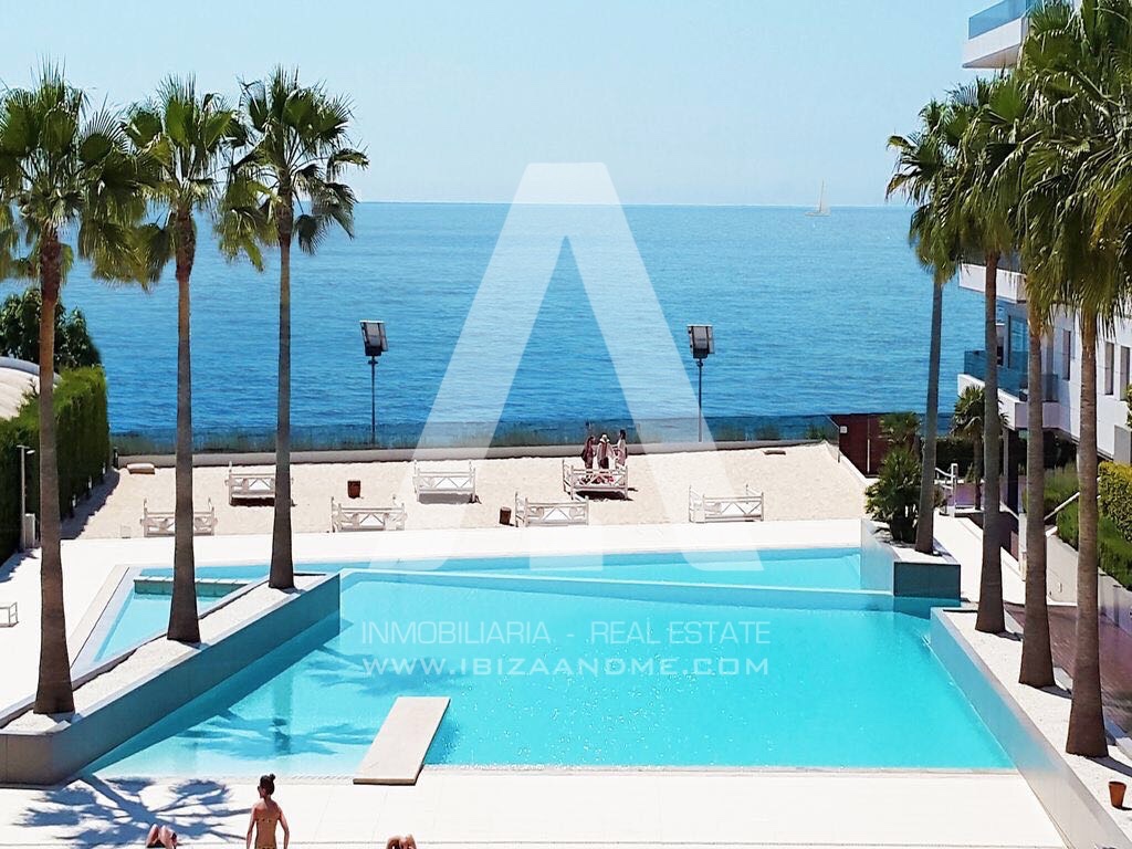 Apartamento a estrenar en primera línea de playa con vistas al mar y a la montaña, en urbanización de lujo, dispone de conserje 24 horas, entrada privada con acceso a la playa den bossa y una gran piscina con zona Chill out. Parada del ferry a Formentera y al puerto de Ibiza a solo 5 metros.