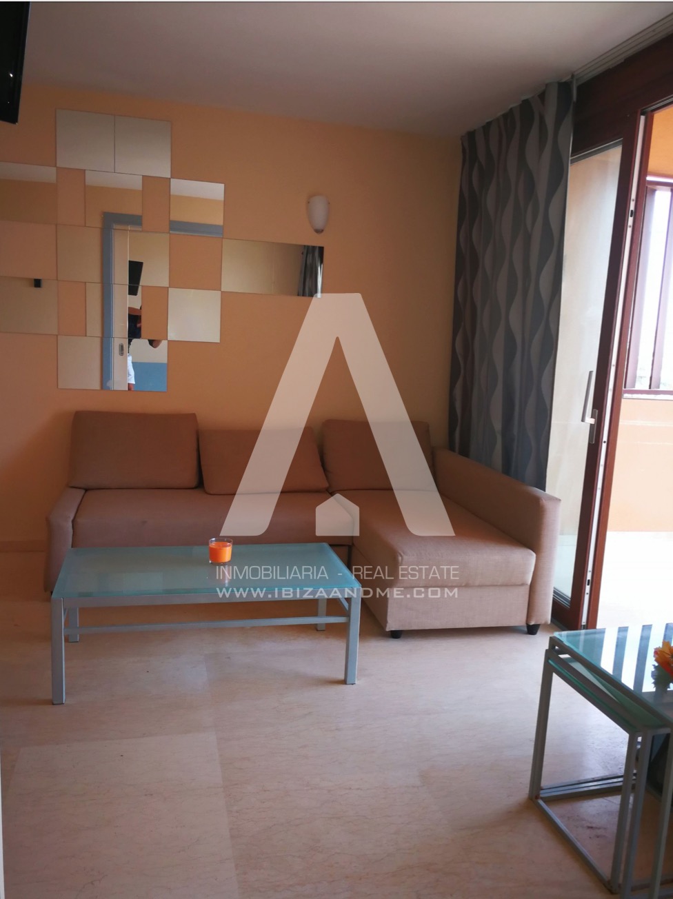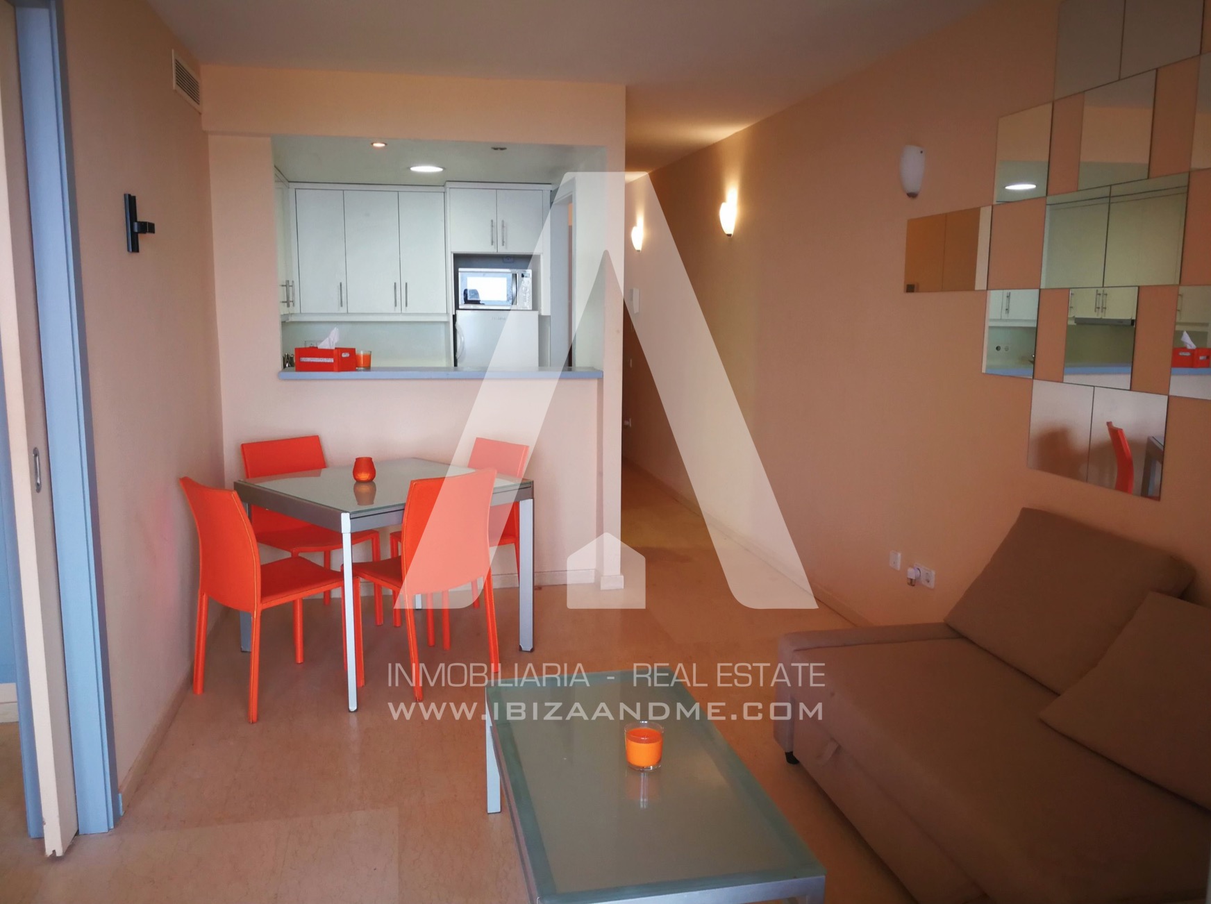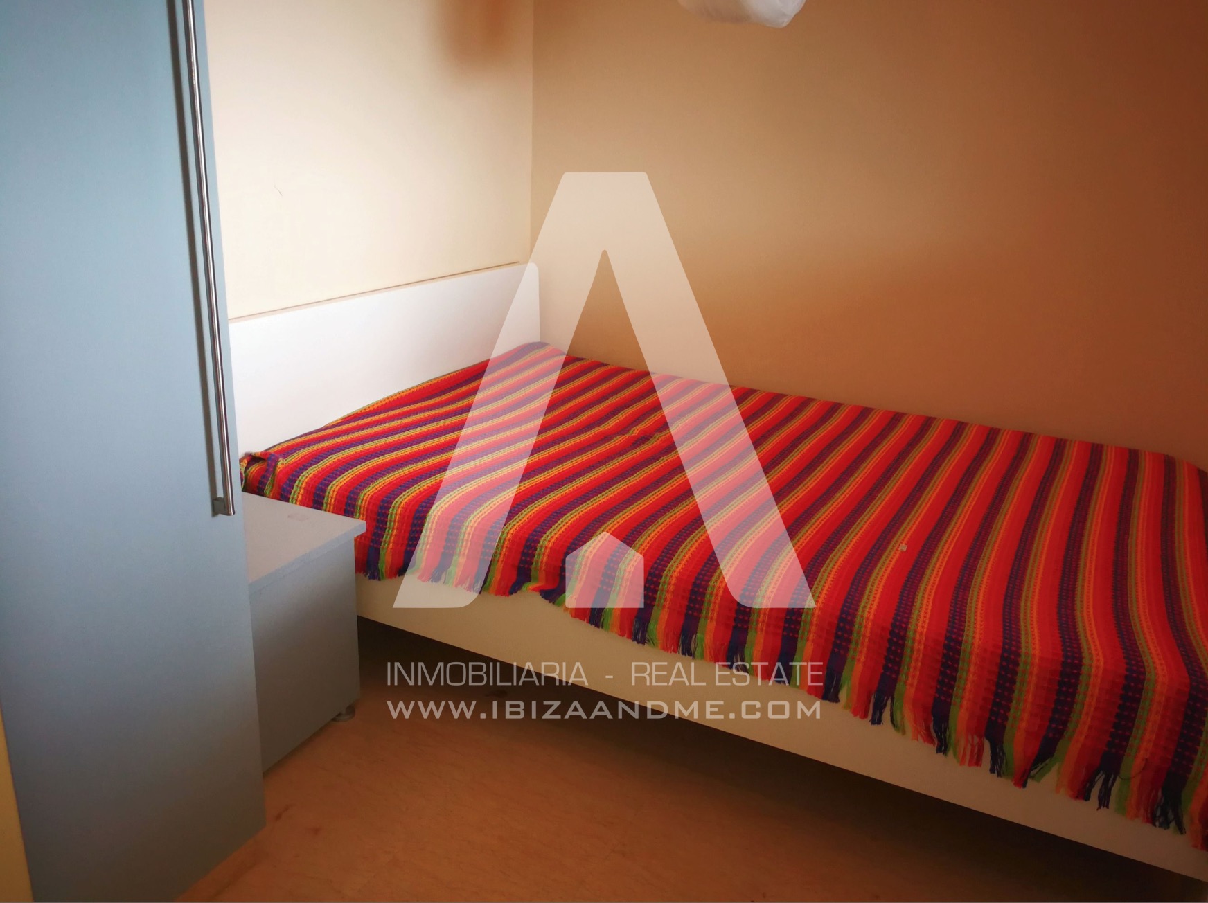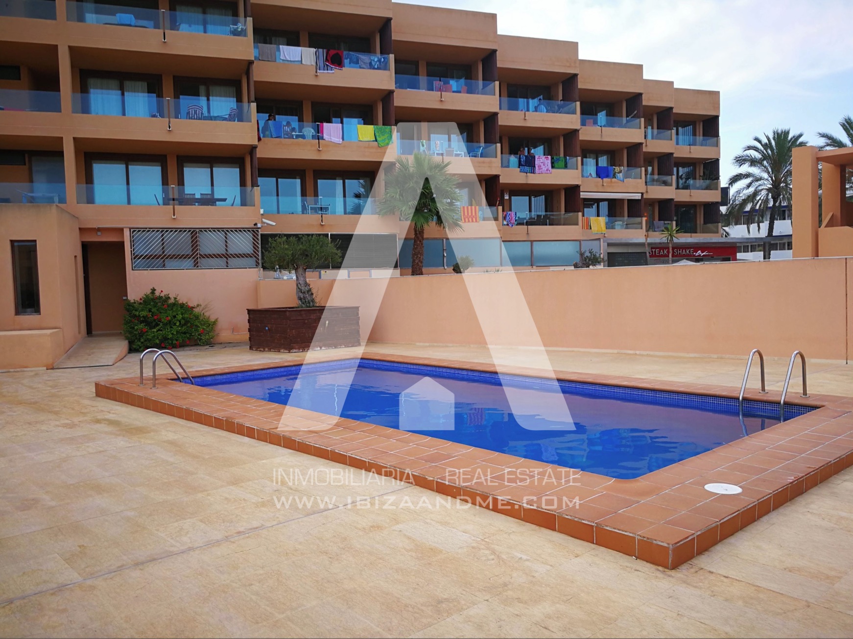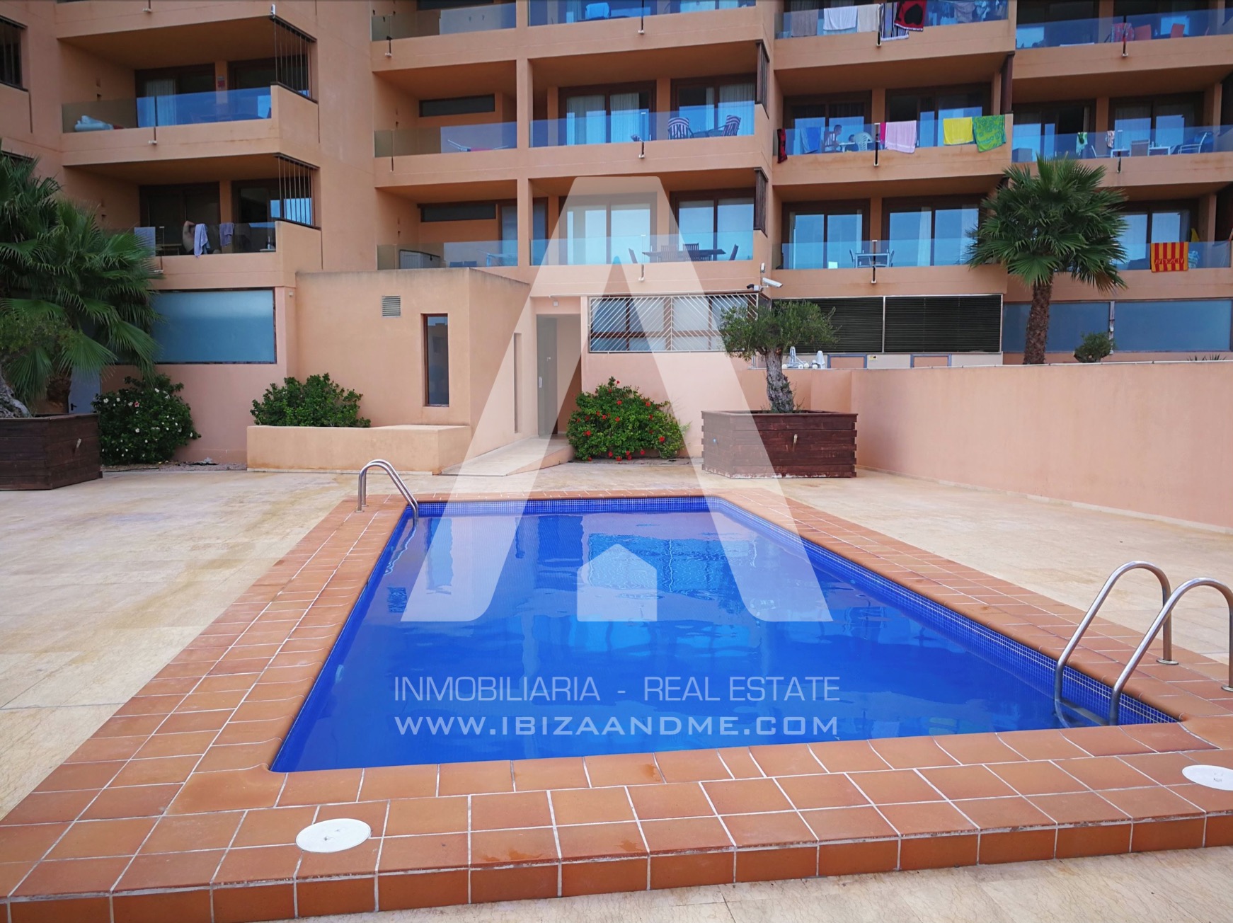 Bonito piso de dos habitaciones con vistas a la Playa de’n Bossa. Cuenta con piscina comunitaria, una pequeña terraza-balcón y plaza de párking. Encontramos un baño y un aseo, y aire acondicionado.