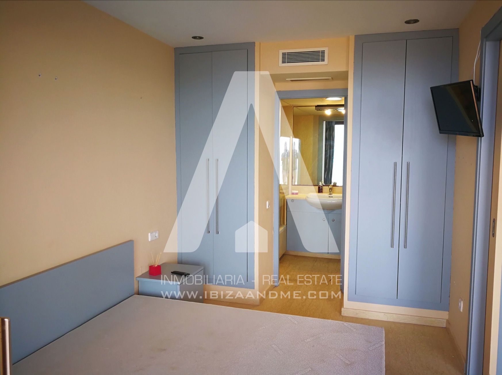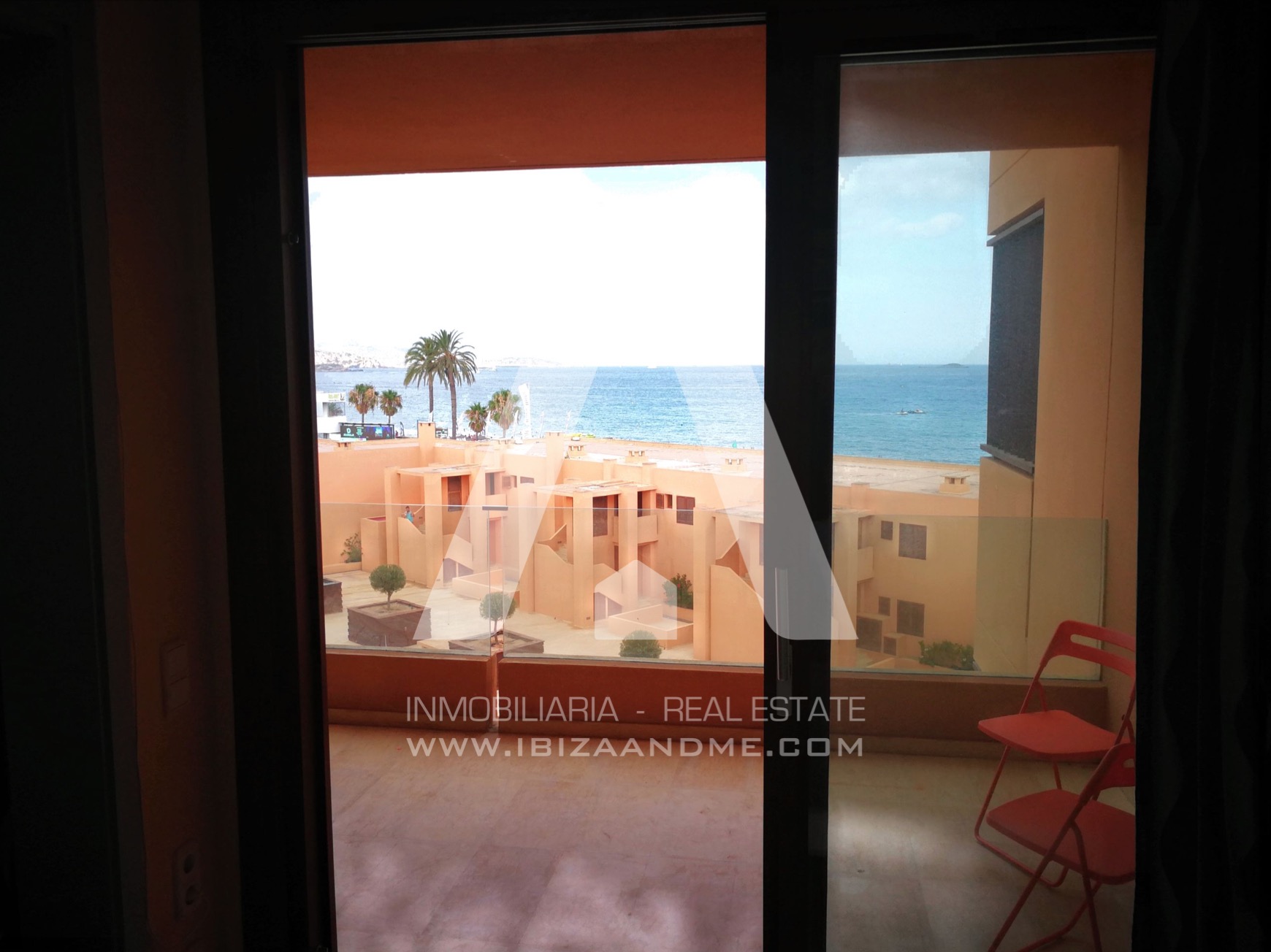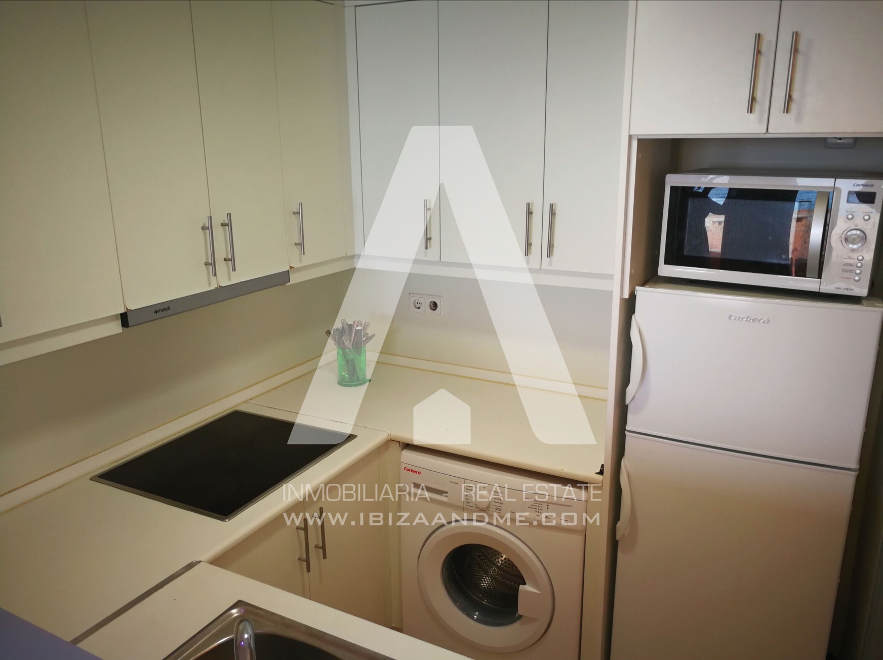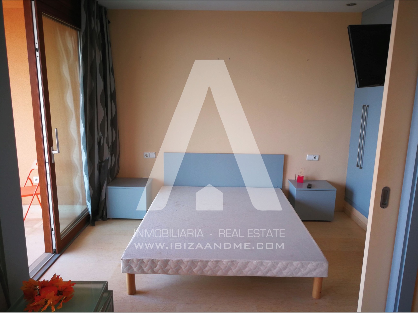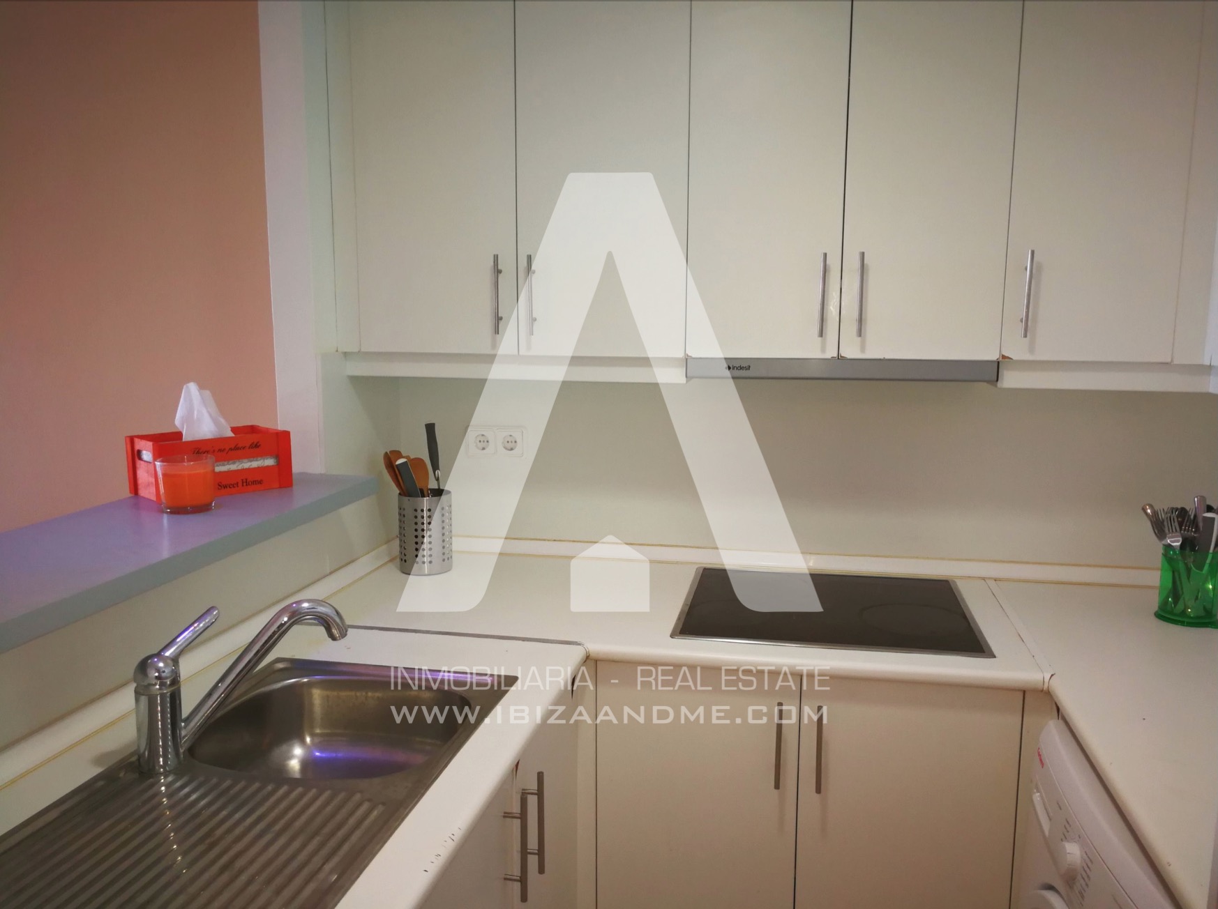 Bonito piso de dos habitaciones con vistas a la Playa de’n Bossa. Cuenta con piscina comunitaria, una pequeña terraza-balcón y plaza de párking. Encontramos un baño y un aseo, y aire acondicionado.