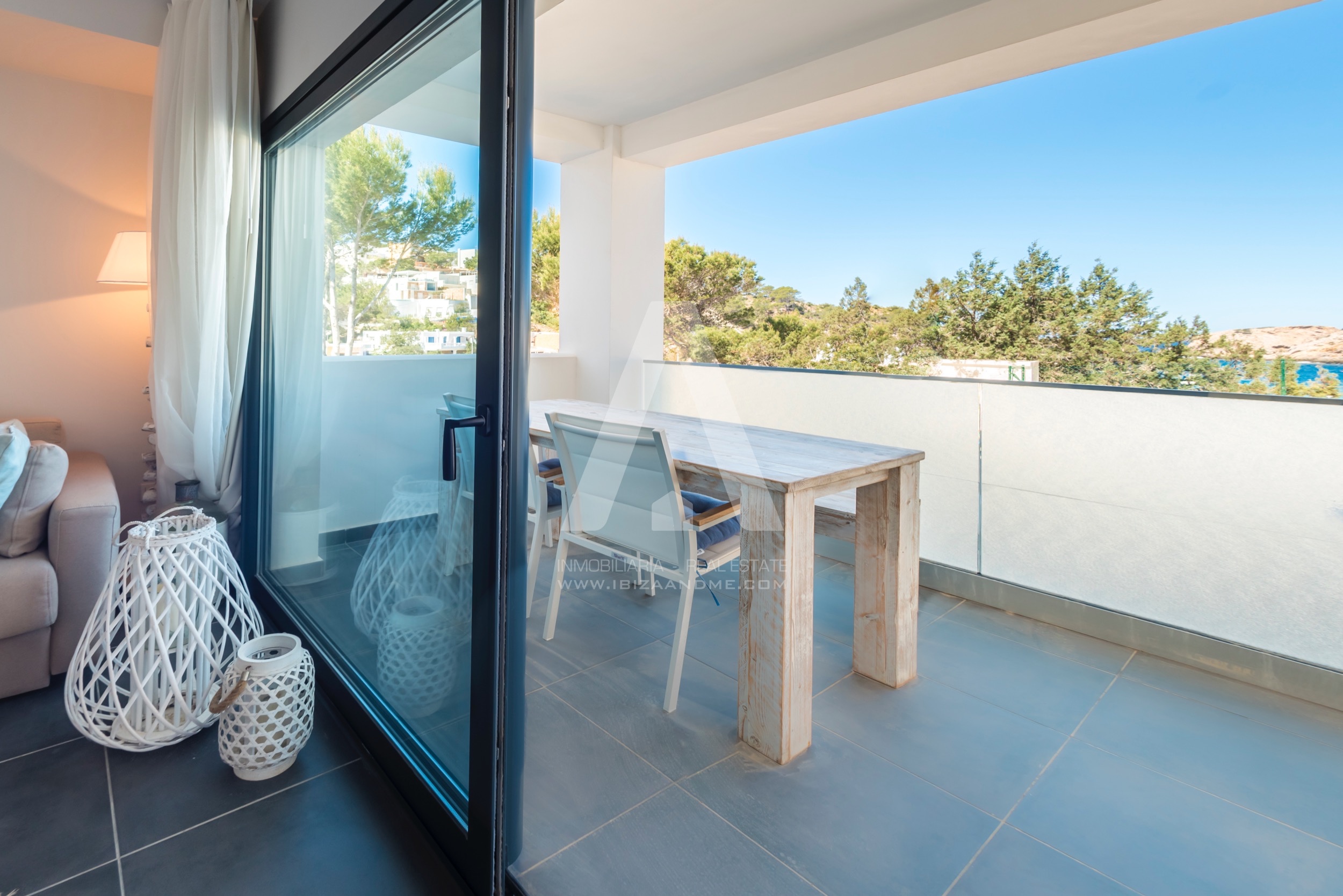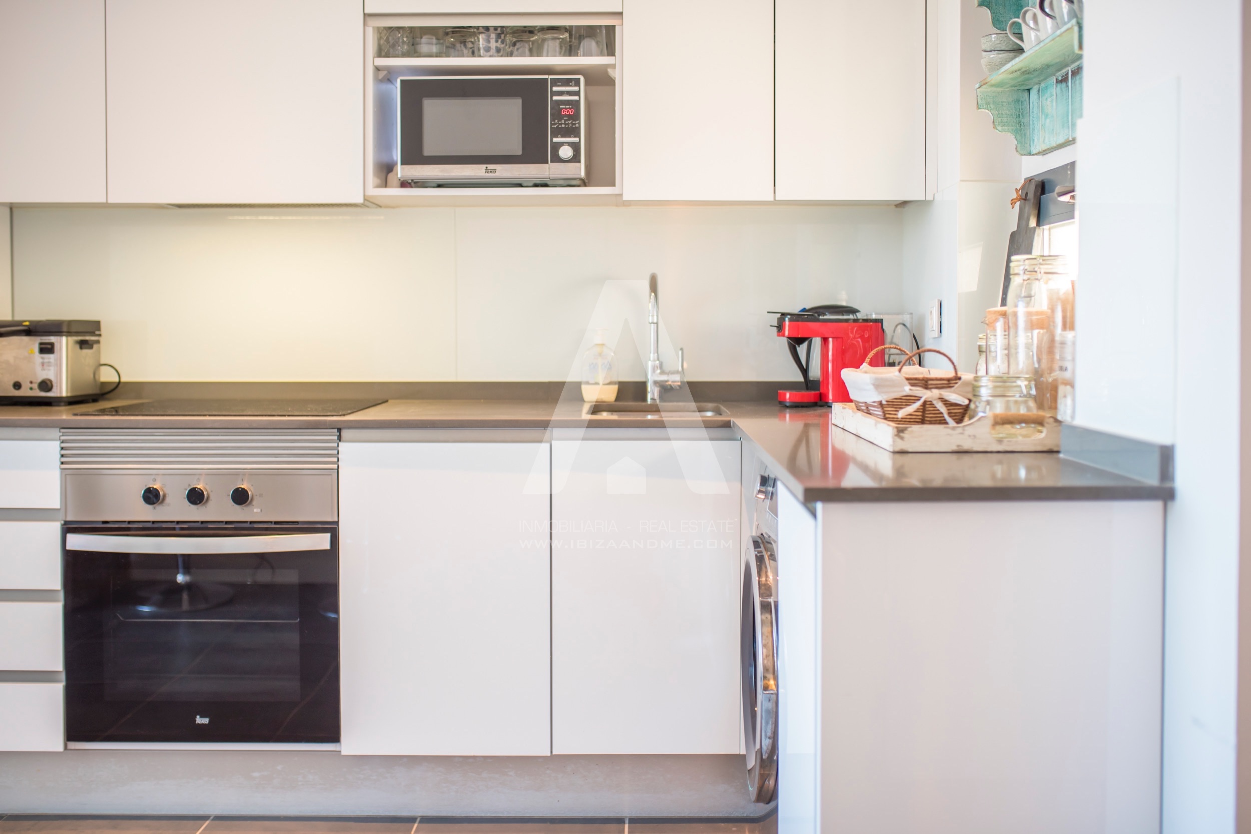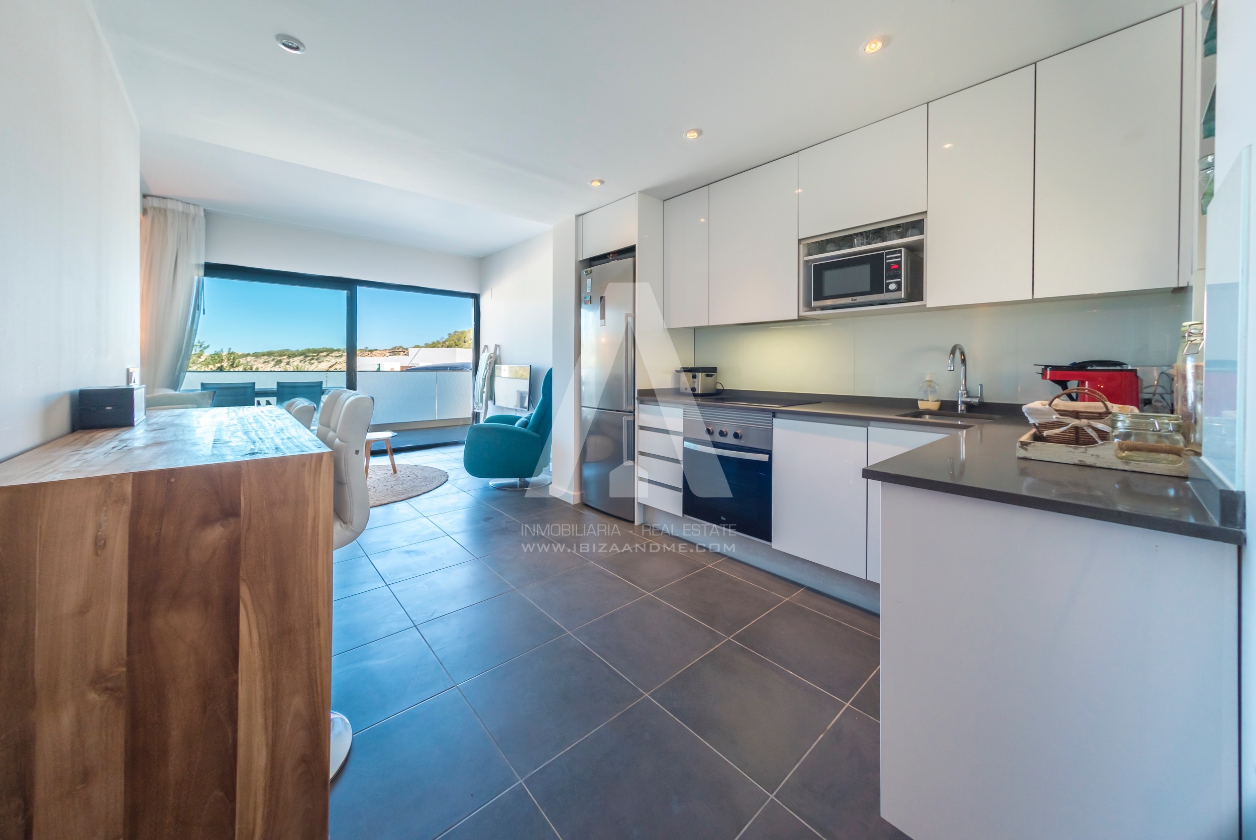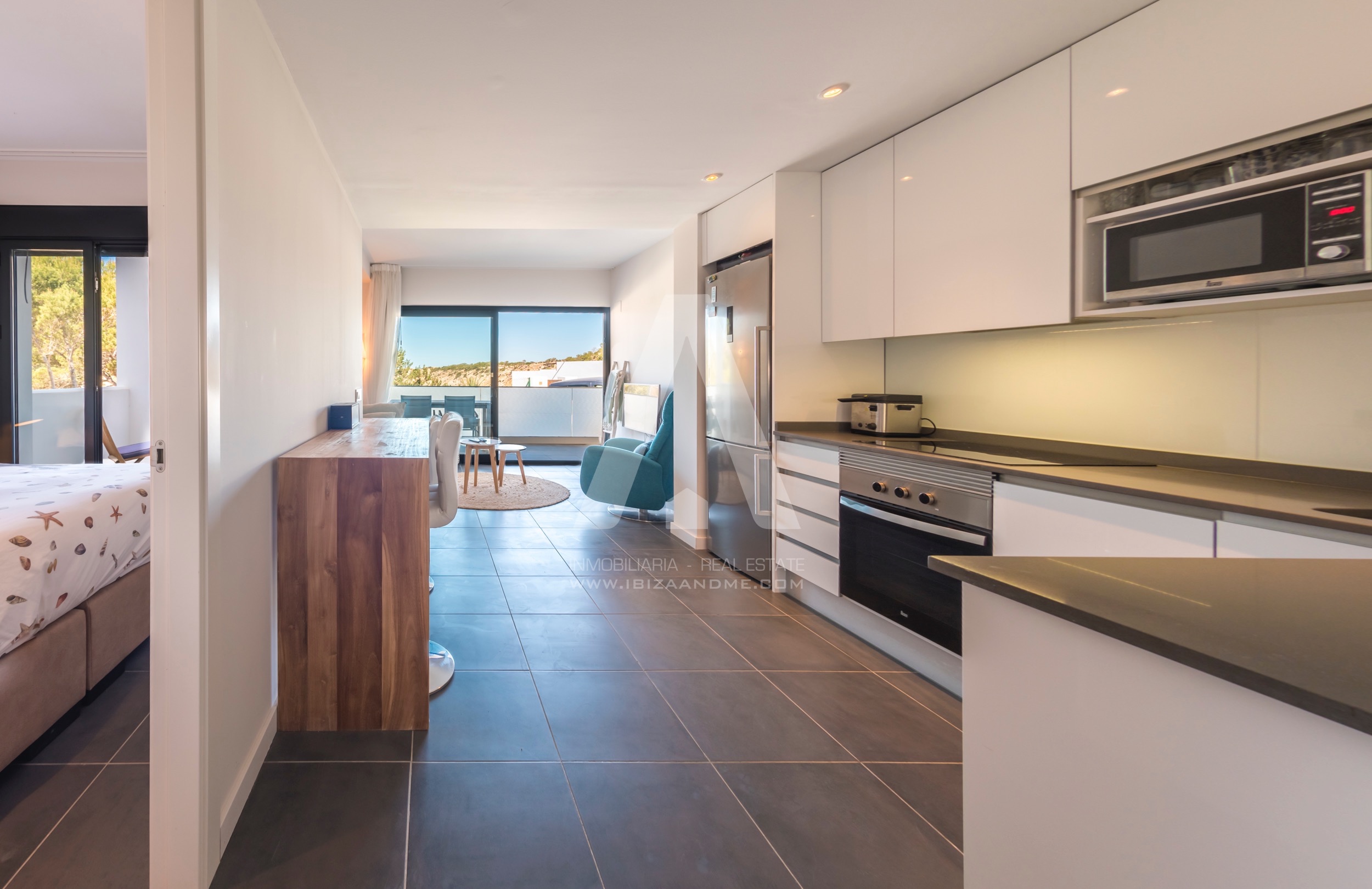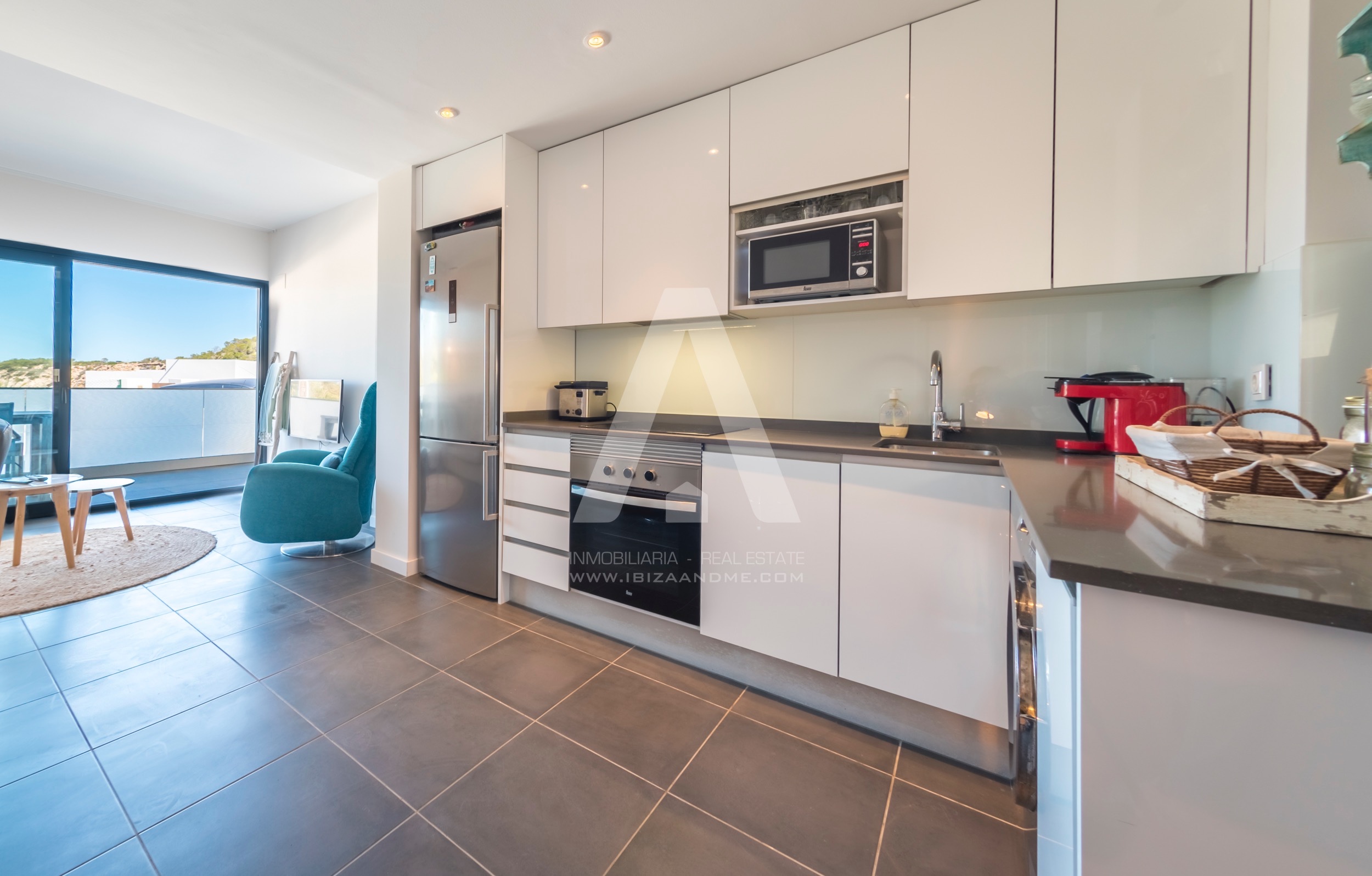 This modern apartment is only a few steps away from the beautiful bay of Cala Vadella. This first line building ‘Coral’ is finished in July 2016 and is well-constructed. From both of the terraces you enjoy the views over the bay. A perfect apartment for a couple or a little family when furnished with a sofa bed. The kitchen is well equipped with modern appliances.