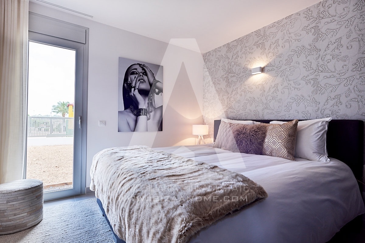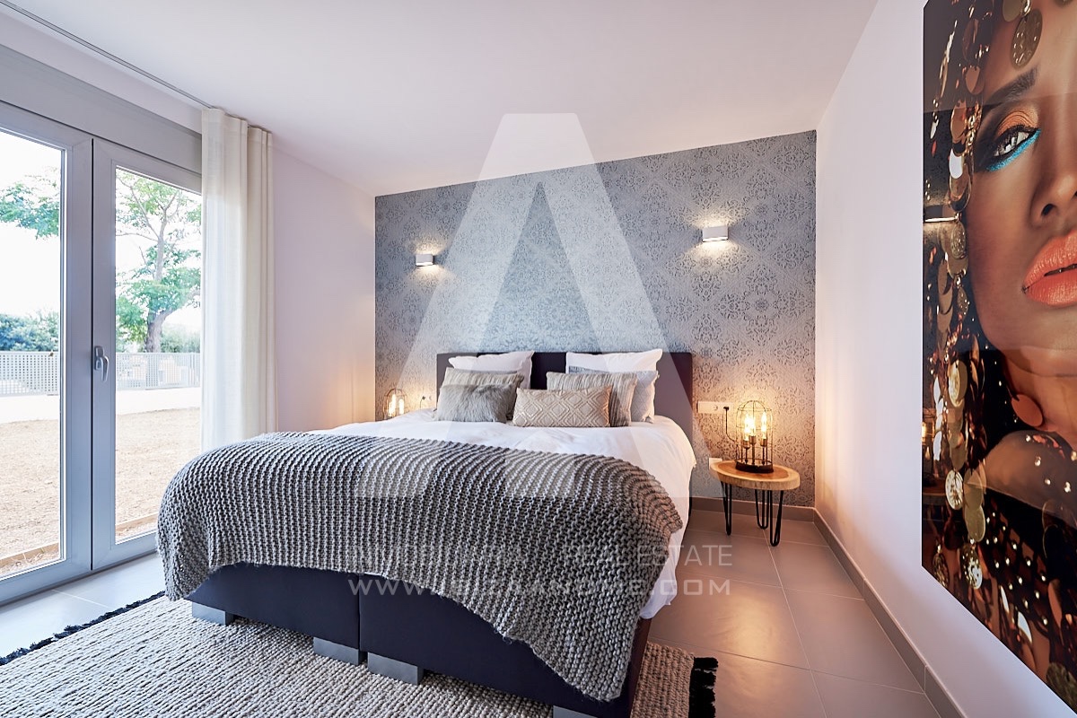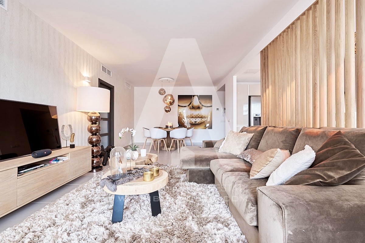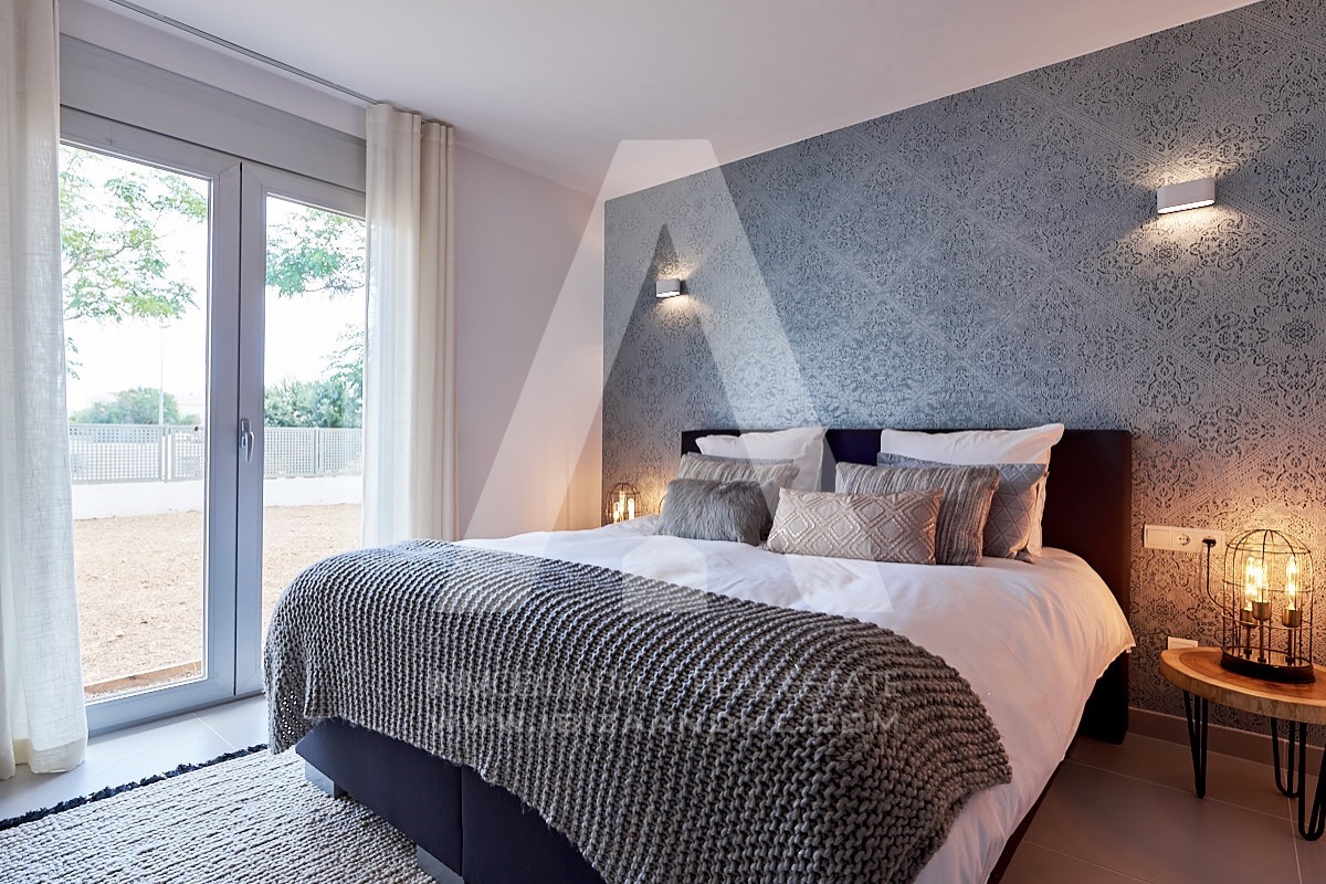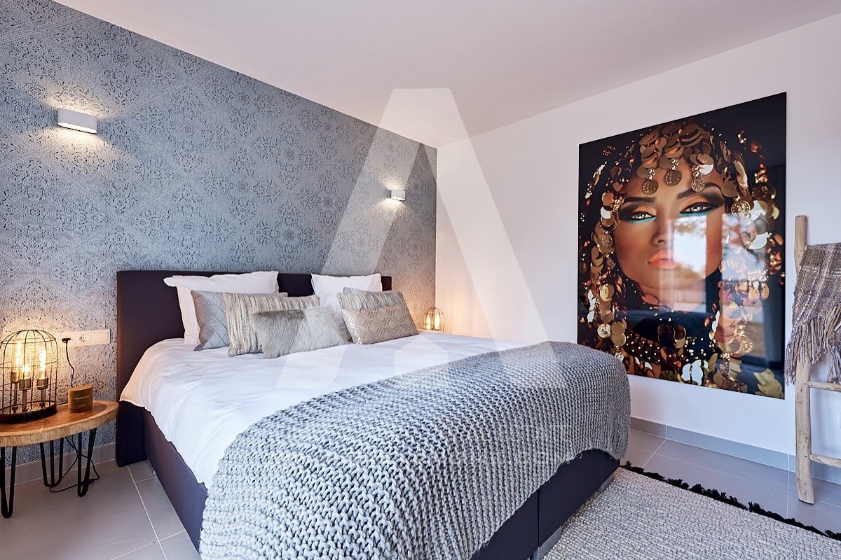 The hypermodern residence is finished to the last detail and furnished with high-quality design. The luxurious interior can be taken over in consultation and ensures you that you can enter without any effort. The spacious residence has a sleek, handle-free kitchen which is equipped with high-quality built-in appliances from Bosch and has an American fridge. There is another big eye-catcher in the house: between the living room and the kitchen is an elegant, oak separation placed. On the kitchen’s side is a bar top constructed, where you can sit comfortably and create more working space. The living room has all the space for a comfortable dining and sitting area. Just like the bedrooms, both the kitchen and living room have direct access to the covered terrace and the spacious garden.