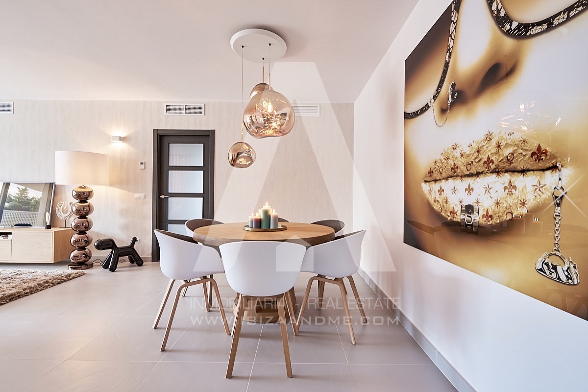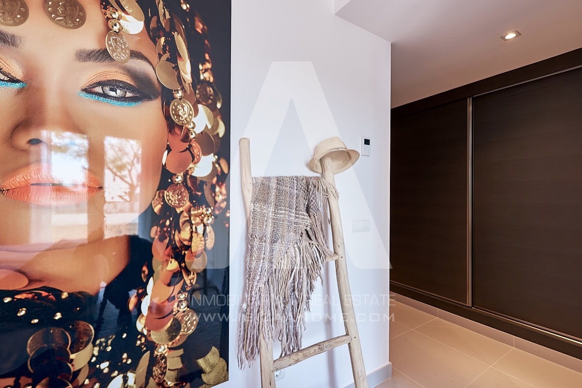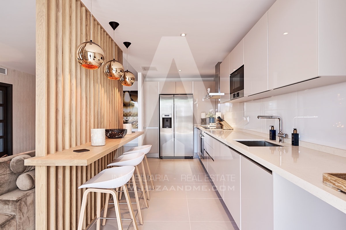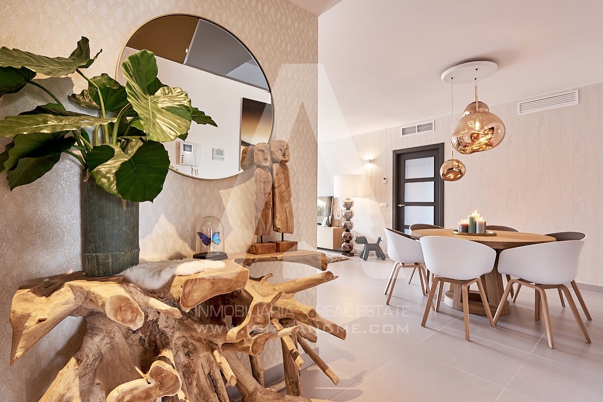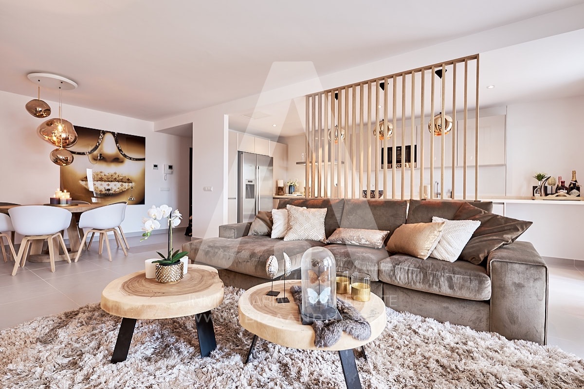The hypermodern residence is finished to the last detail and furnished with high-quality design. The luxurious interior can be taken over in consultation and ensures you that you can enter without any effort. The spacious residence has a sleek, handle-free kitchen which is equipped with high-quality built-in appliances from Bosch and has an American fridge. There is another big eye-catcher in the house: between the living room and the kitchen is an elegant, oak separation placed. On the kitchen’s side is a bar top constructed, where you can sit comfortably and create more working space. The living room has all the space for a comfortable dining and sitting area. Just like the bedrooms, both the kitchen and living room have direct access to the covered terrace and the spacious garden.
