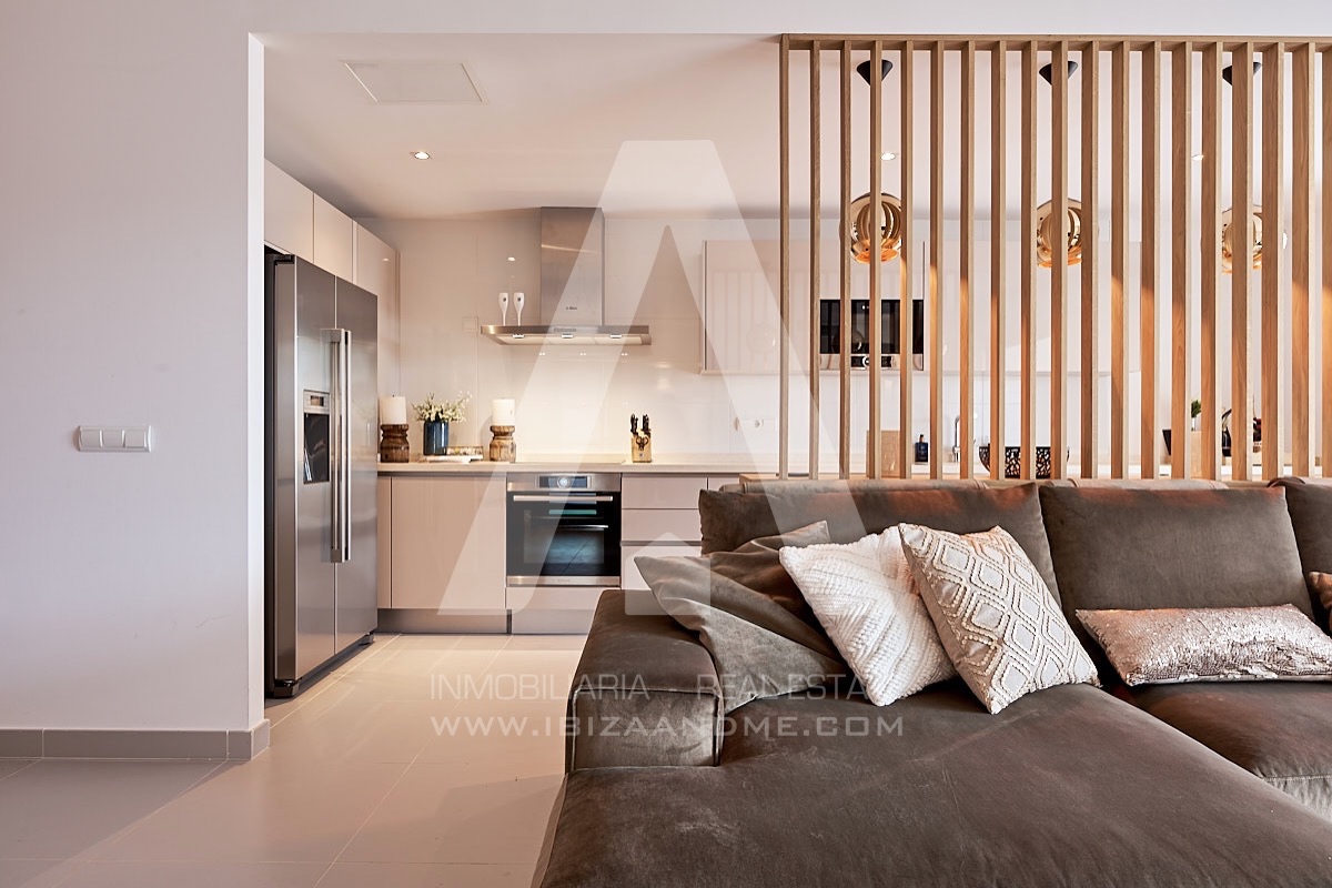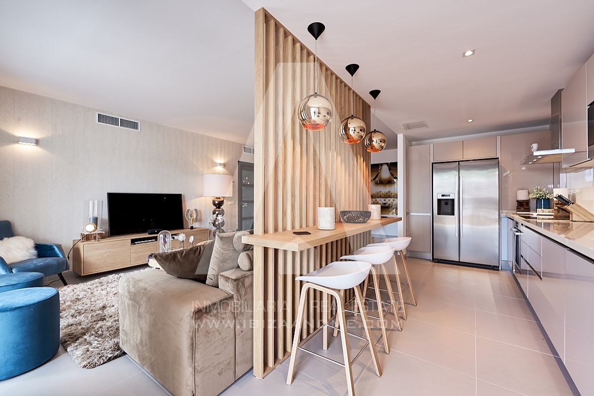 Encontramos también entre la sala de estar y la cocina una elegante separación de roble colocada. En el lado de la cocina hay una barra de bar, donde puede sentarse cómodamente y crear más espacio de trabajo. El salón tiene todo el espacio para convertirse en una cómoda sala de estar y comedor. Al igual que las habitaciones, tanto la cocina como el salón tienen acceso directo a la terraza cubierta y al amplio jardín.
