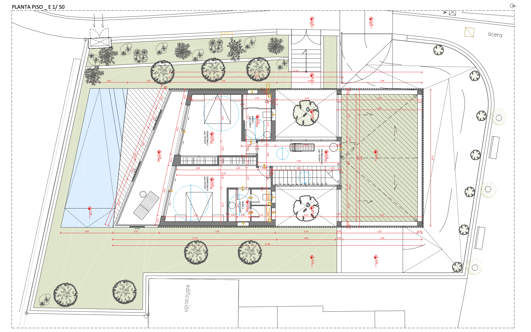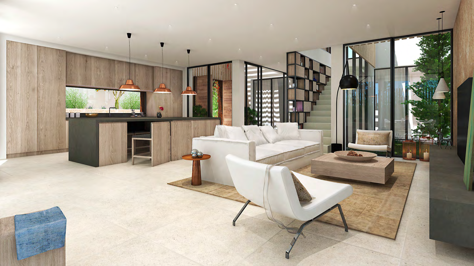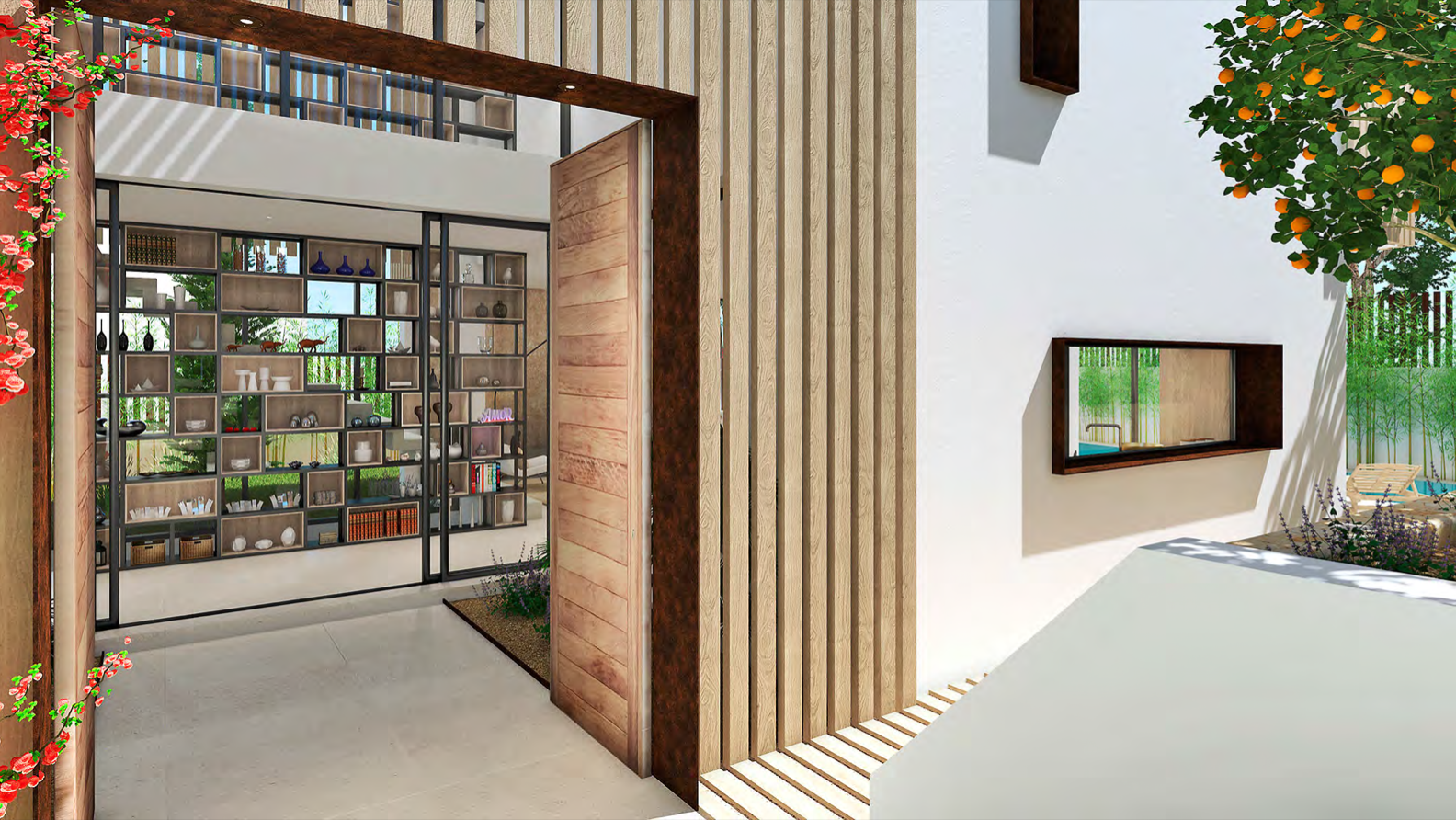Con Acceso desde la Calle, mediante una escalera central. La puerta de entrada interconecta con el patio de acceso en doble altura que da acceso a la vivienda que se distribuye por el Núcleo – un Espacio Diáfano que comunica tanto en horizontal como en vertical la vivienda desde el Hall – flanqueado por una estantería biblioteca de suelo a techo.