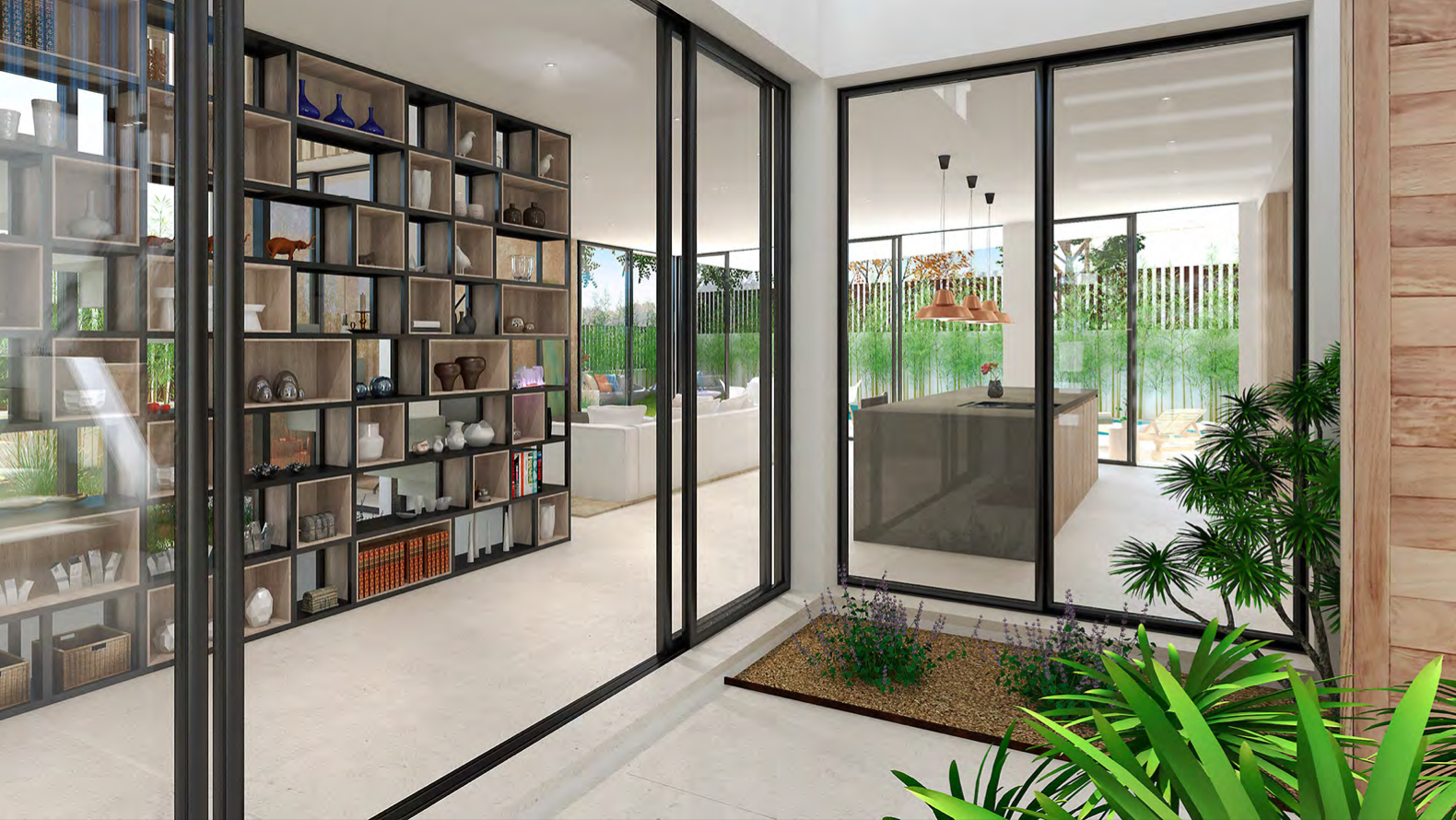 With access from the street, through a central staircase. The entrance door interconnects with the double height access patio that gives access to the house that is distributed by the Nucleus – a Diaphanous Space that communicates both horizontally and vertically the house from the Hall – flanked by a floor library shelf to ceiling.