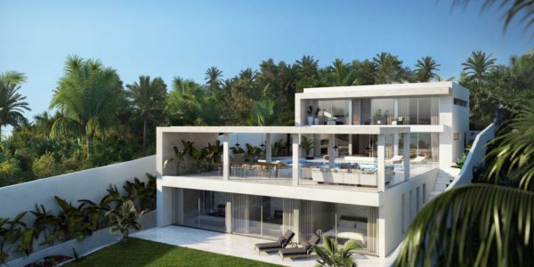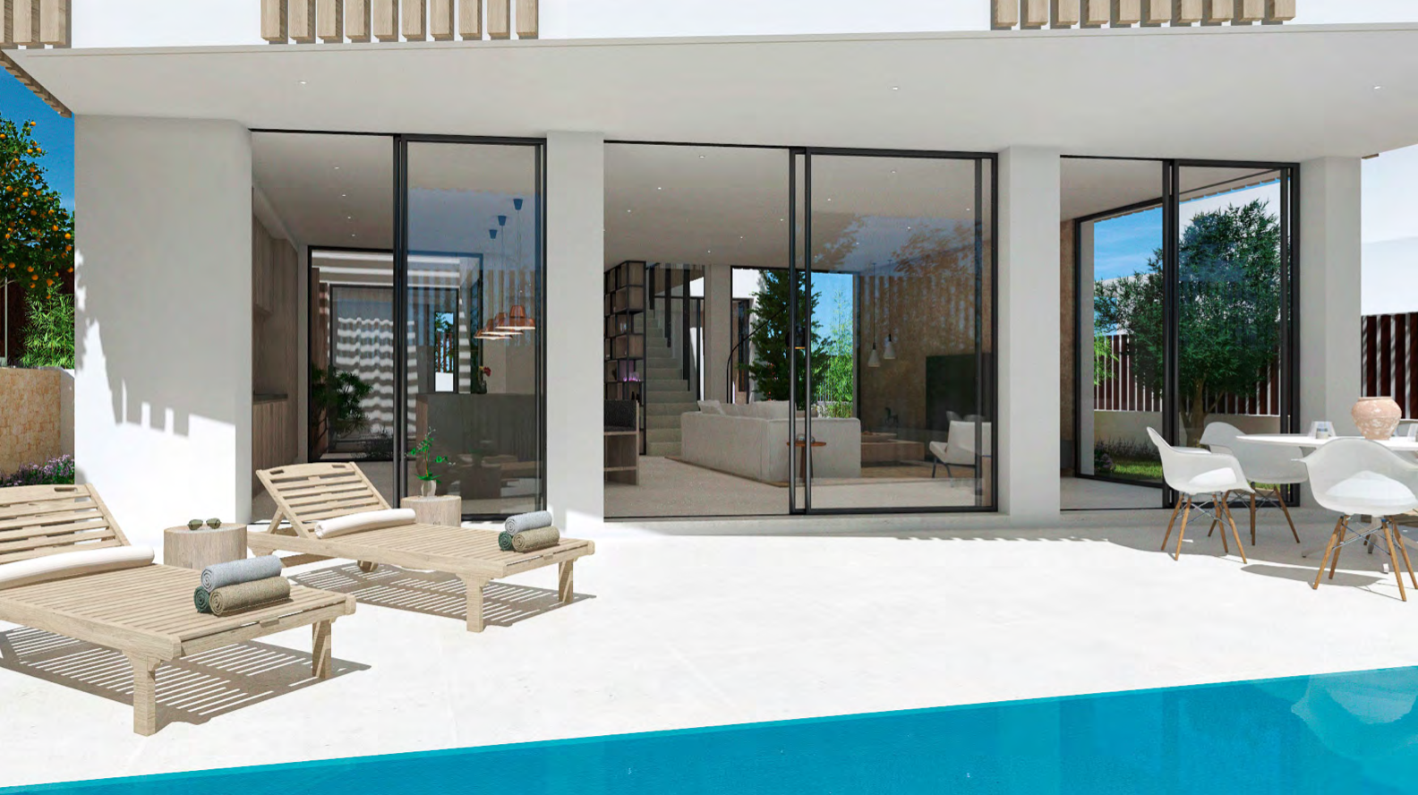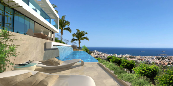 Piscina de diseño de forma trapezoidal con zona de disfrute de las vistas